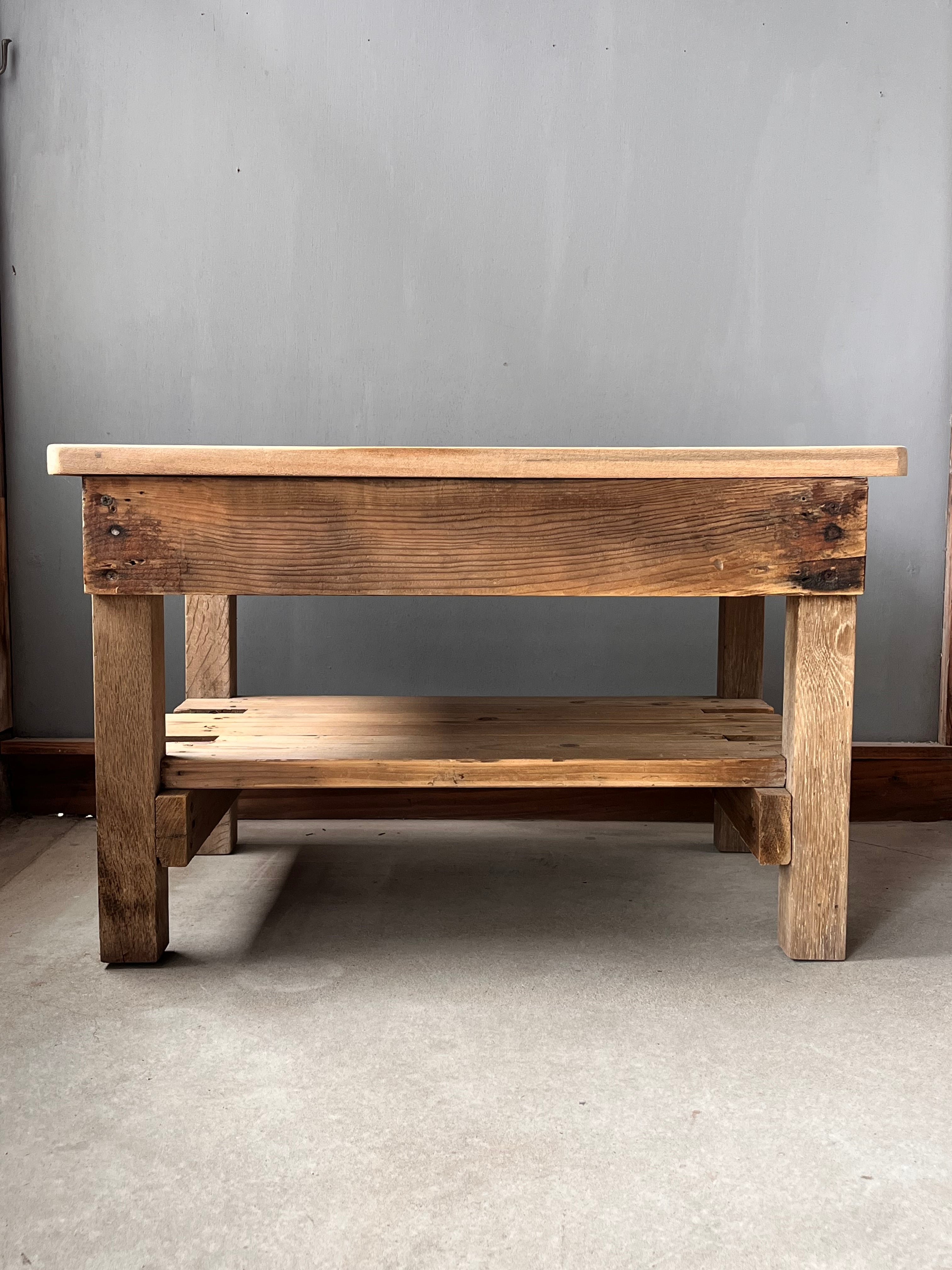 欅の天板を使用した風合い良い台。荒れた木肌が植物の台にマッチしそう。まだ若いですが、雰囲気あります。