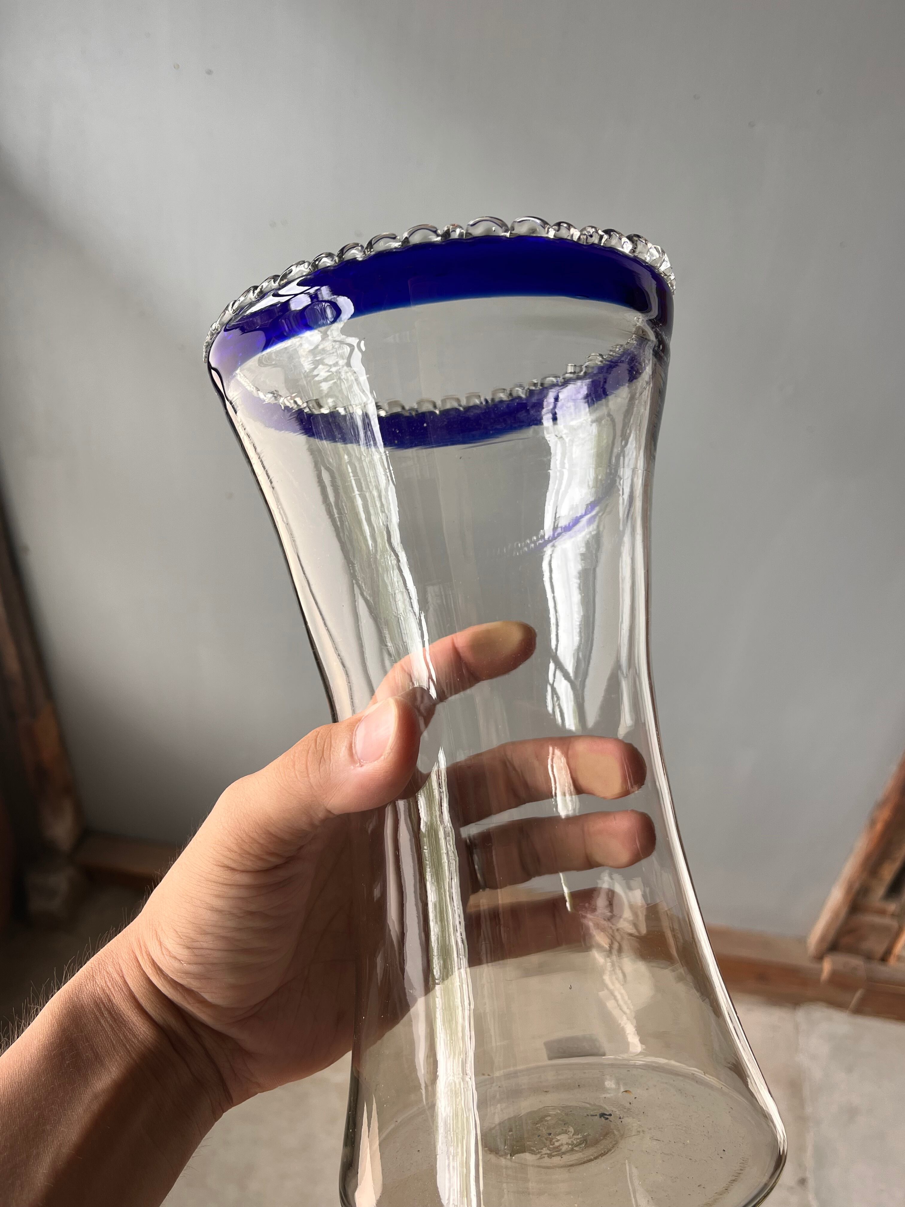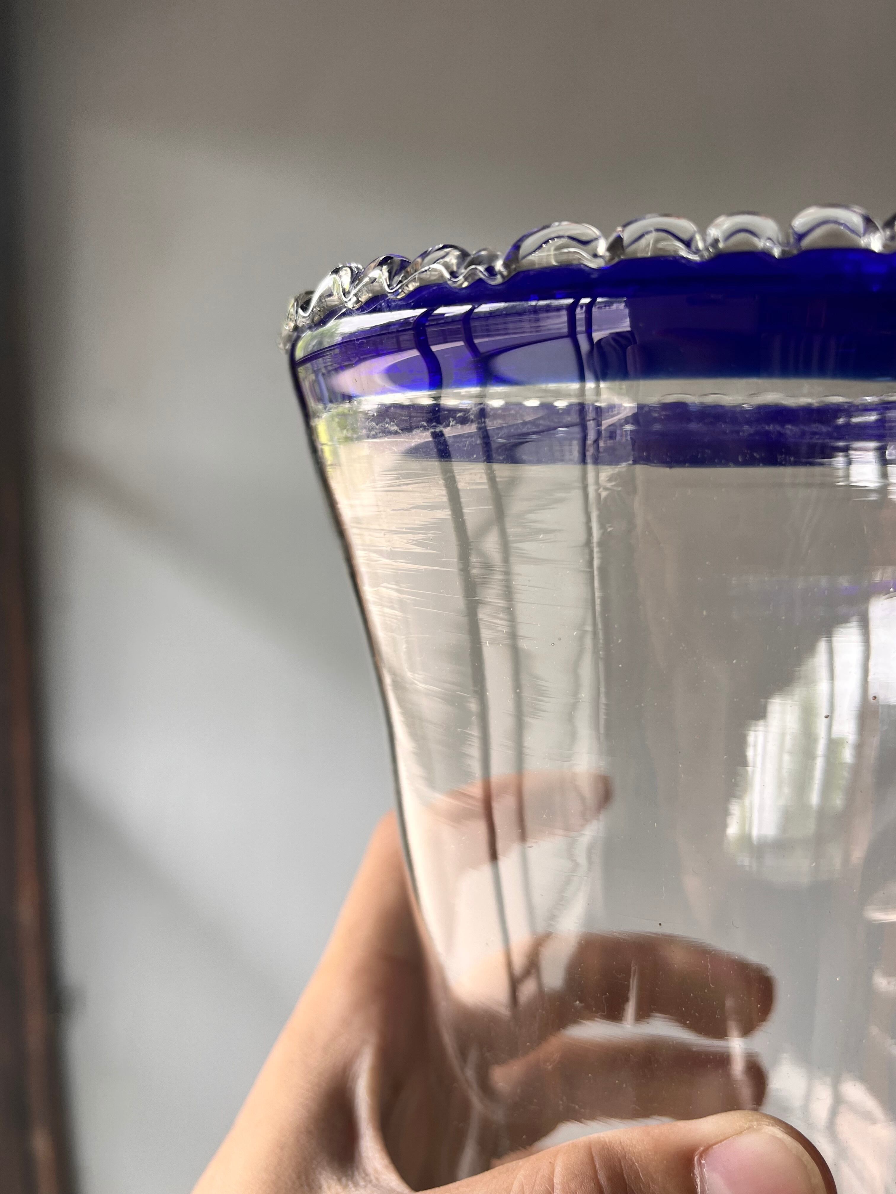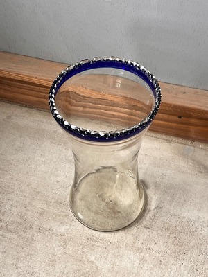 上部にはフリルのようなデザインで深みのブルーライトから静けさを感じます。ガラスは少し黄色みがかっていて、古さも楽しめます。