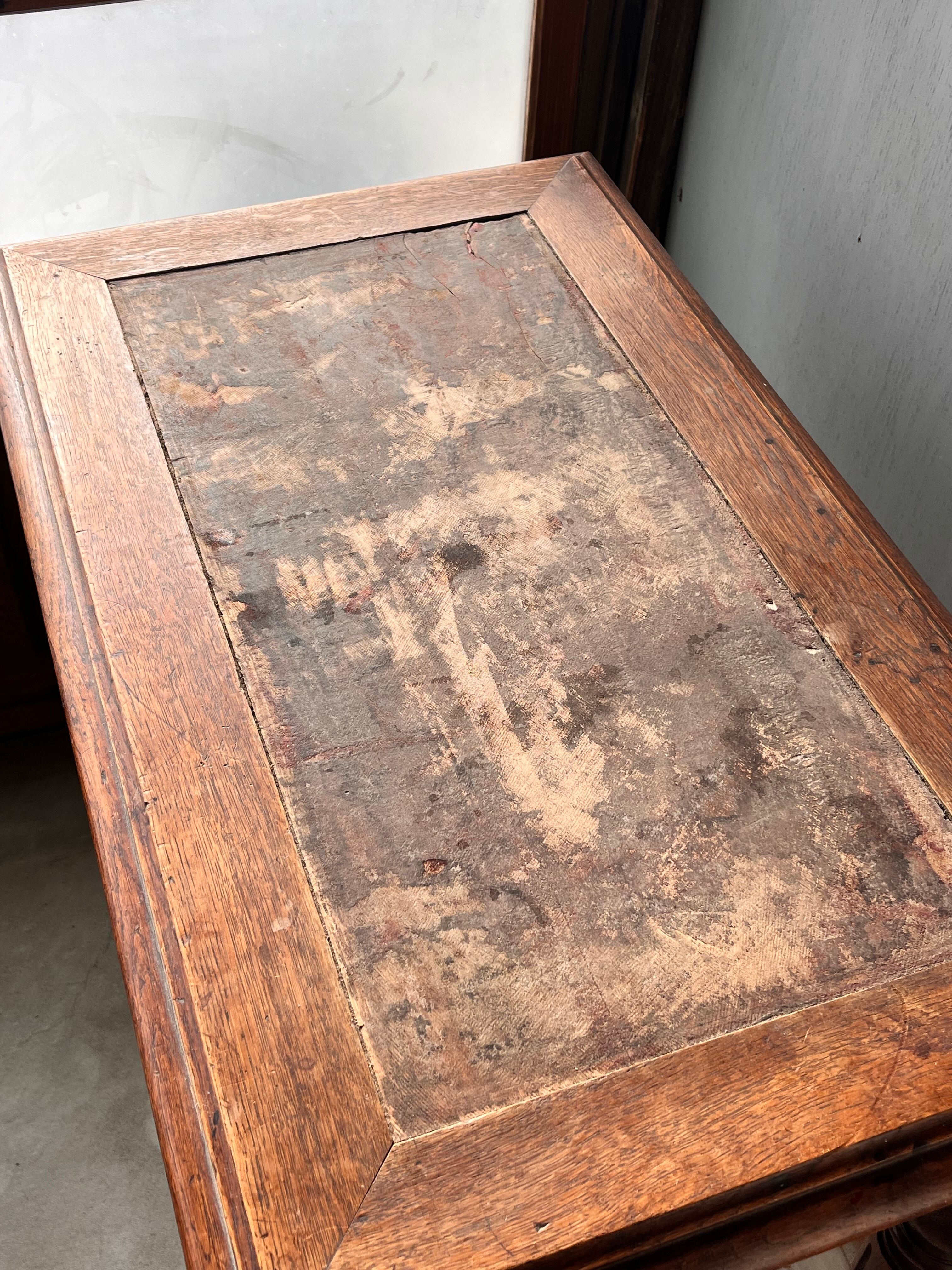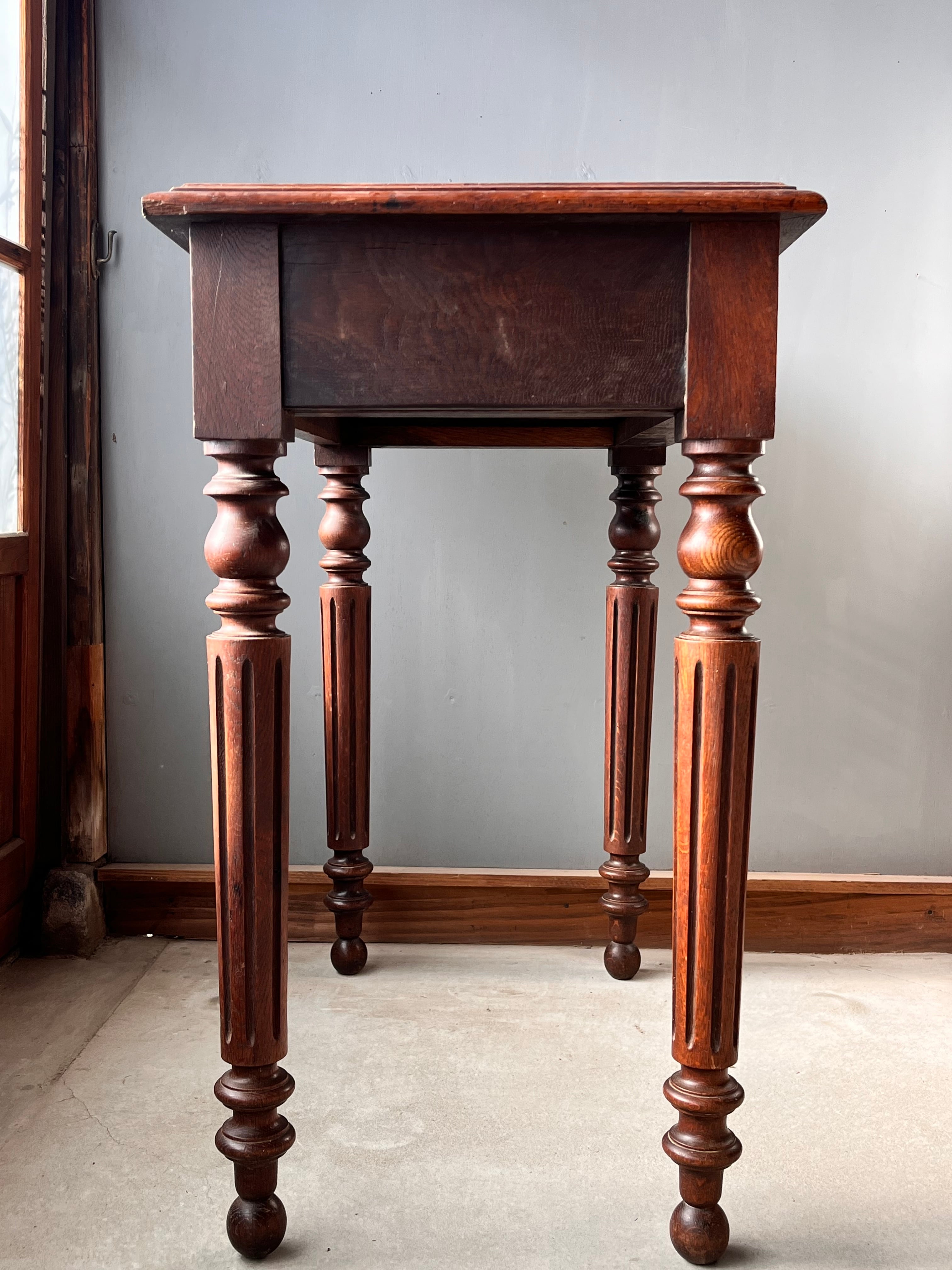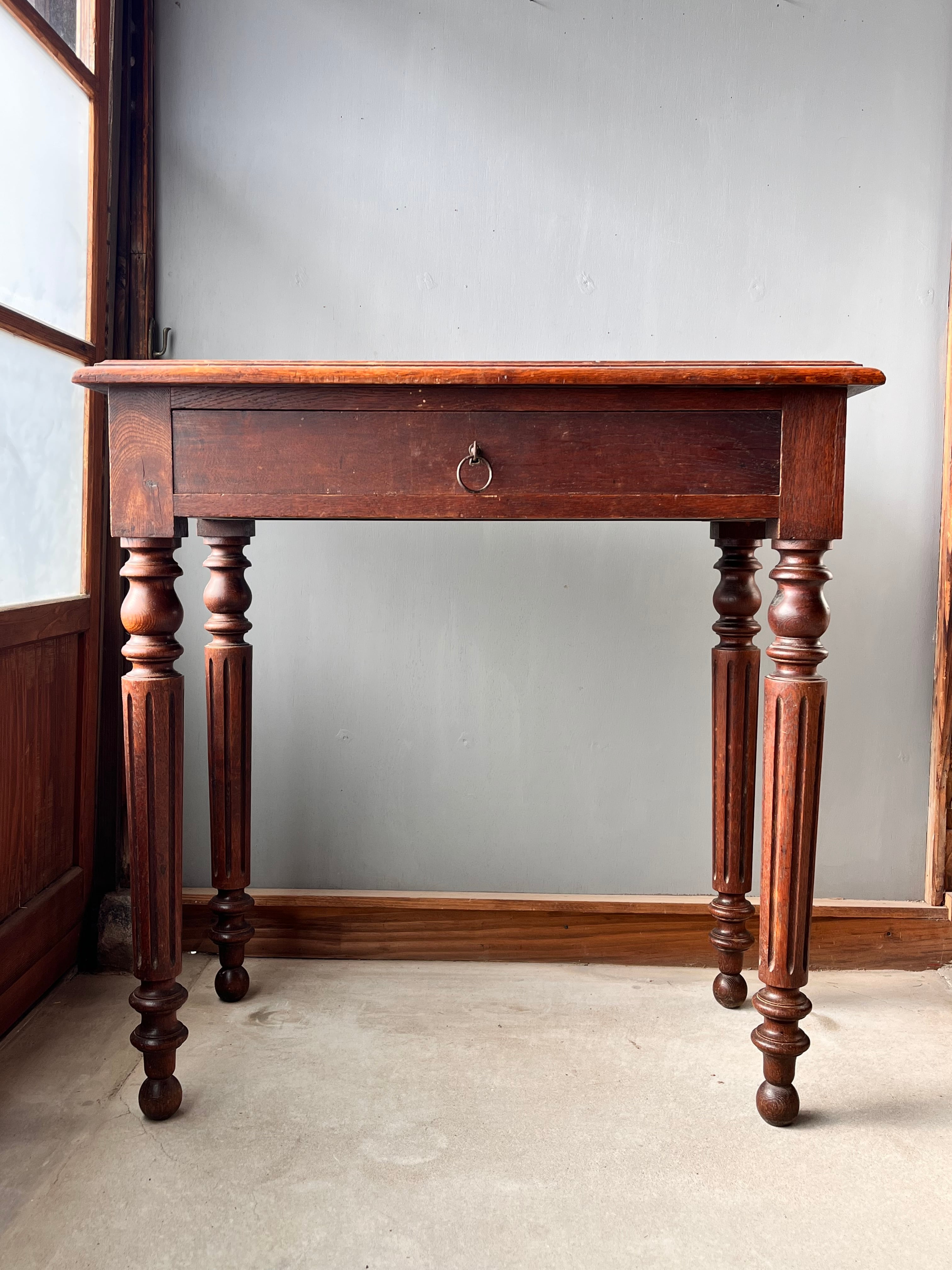 丸みのある脚のデザインが素敵です。鍵はついておりますが、鍵をかけることは出来ません。天板は革などが張ってあったのでしょう。重厚感もあり素敵なお品です。