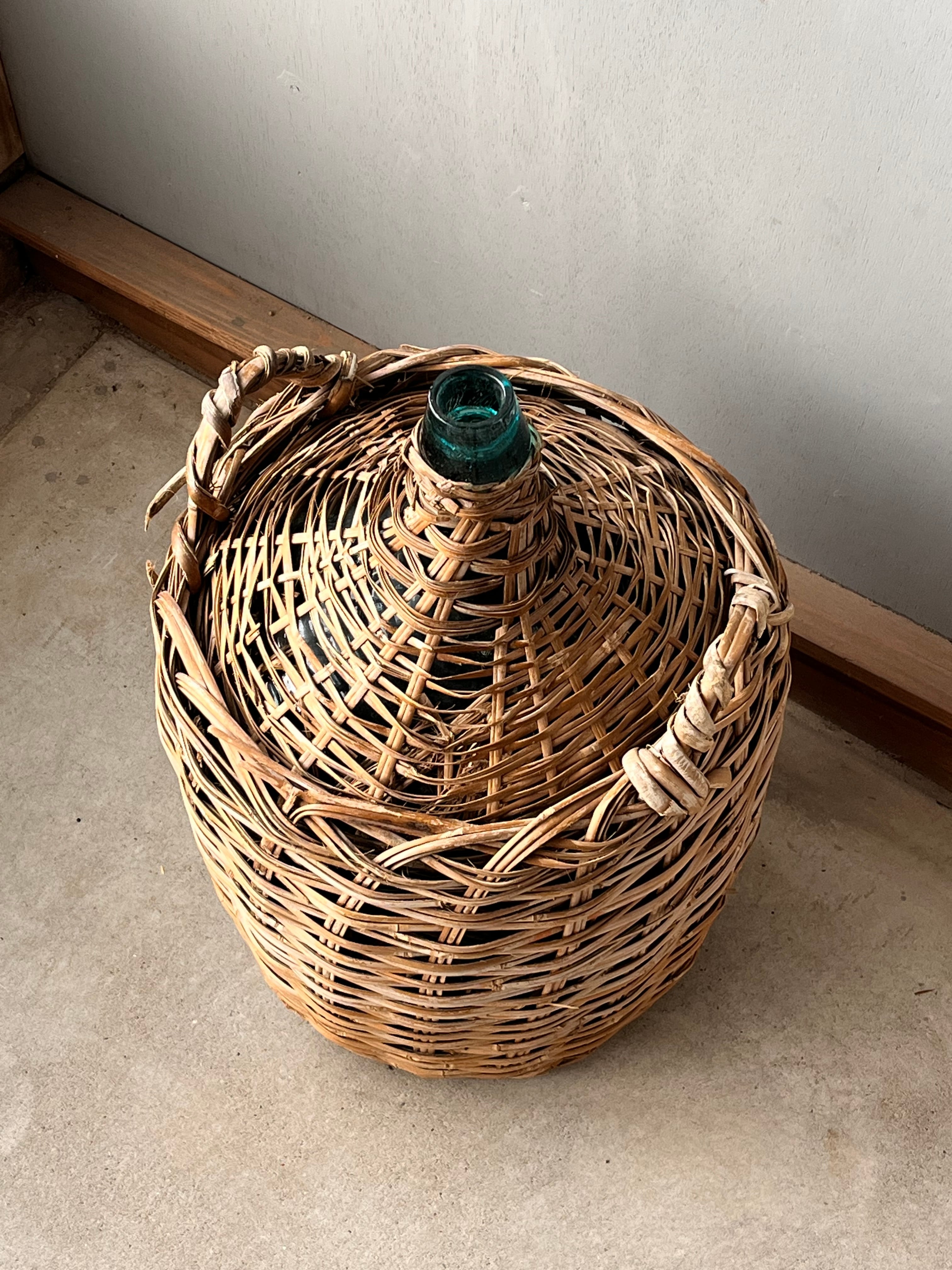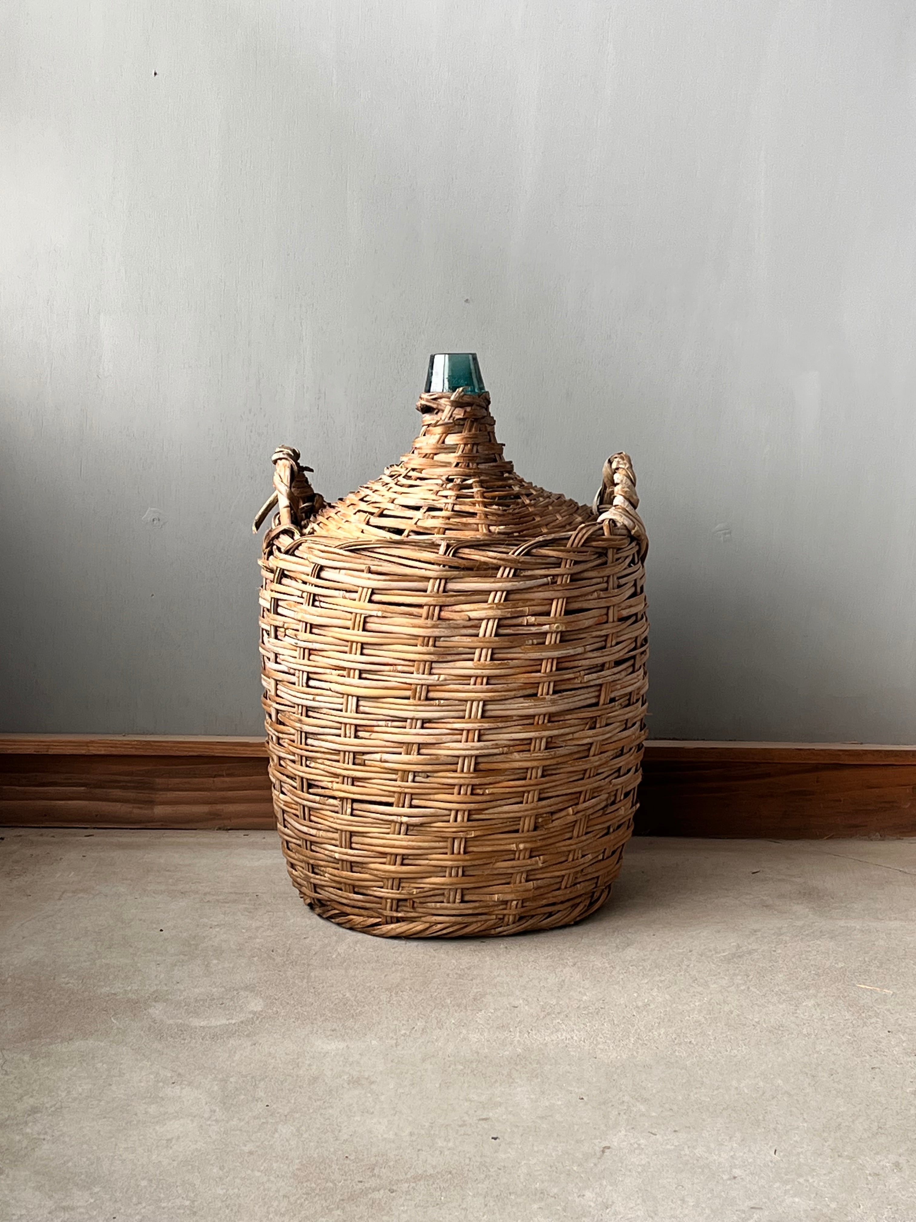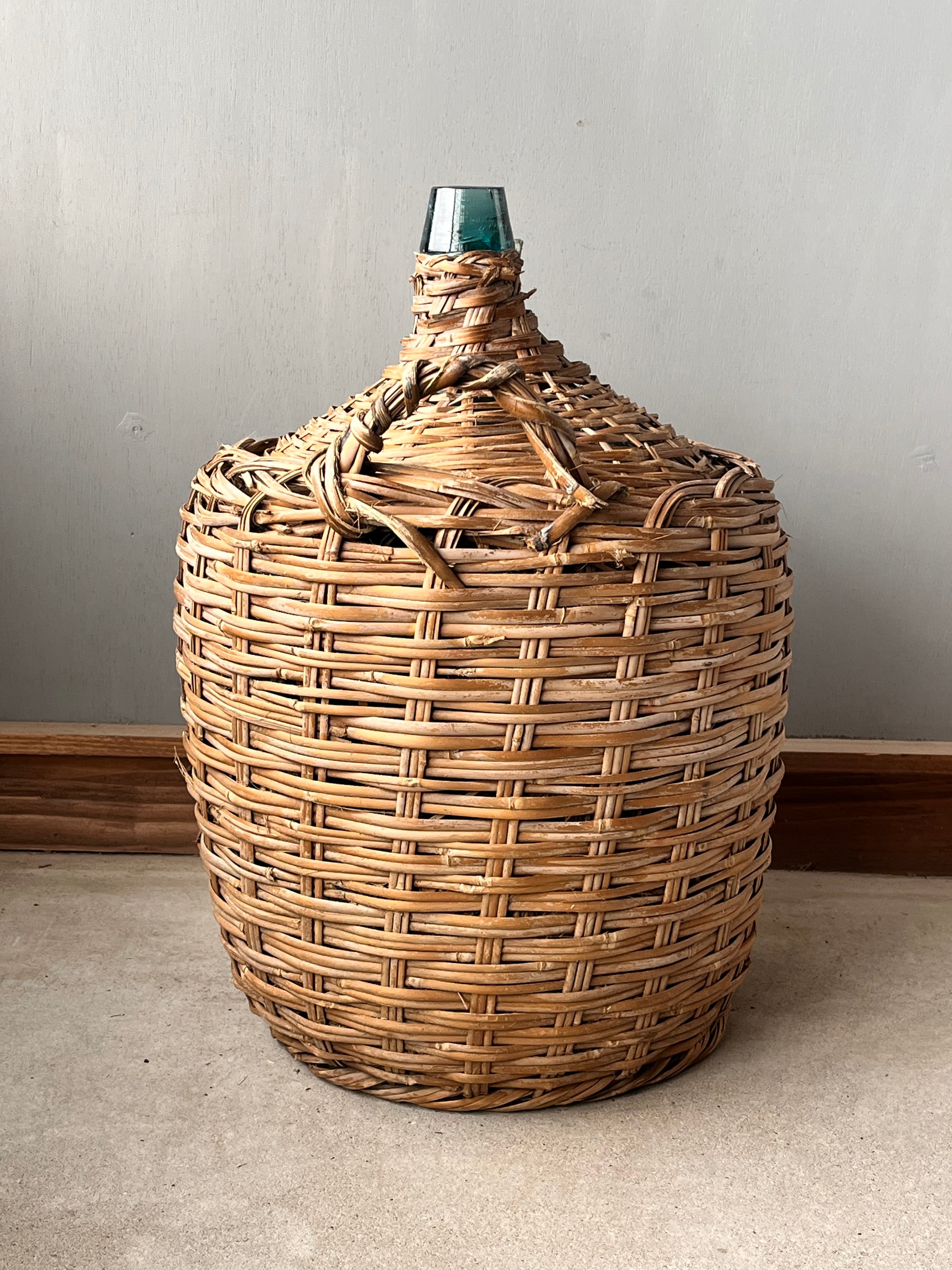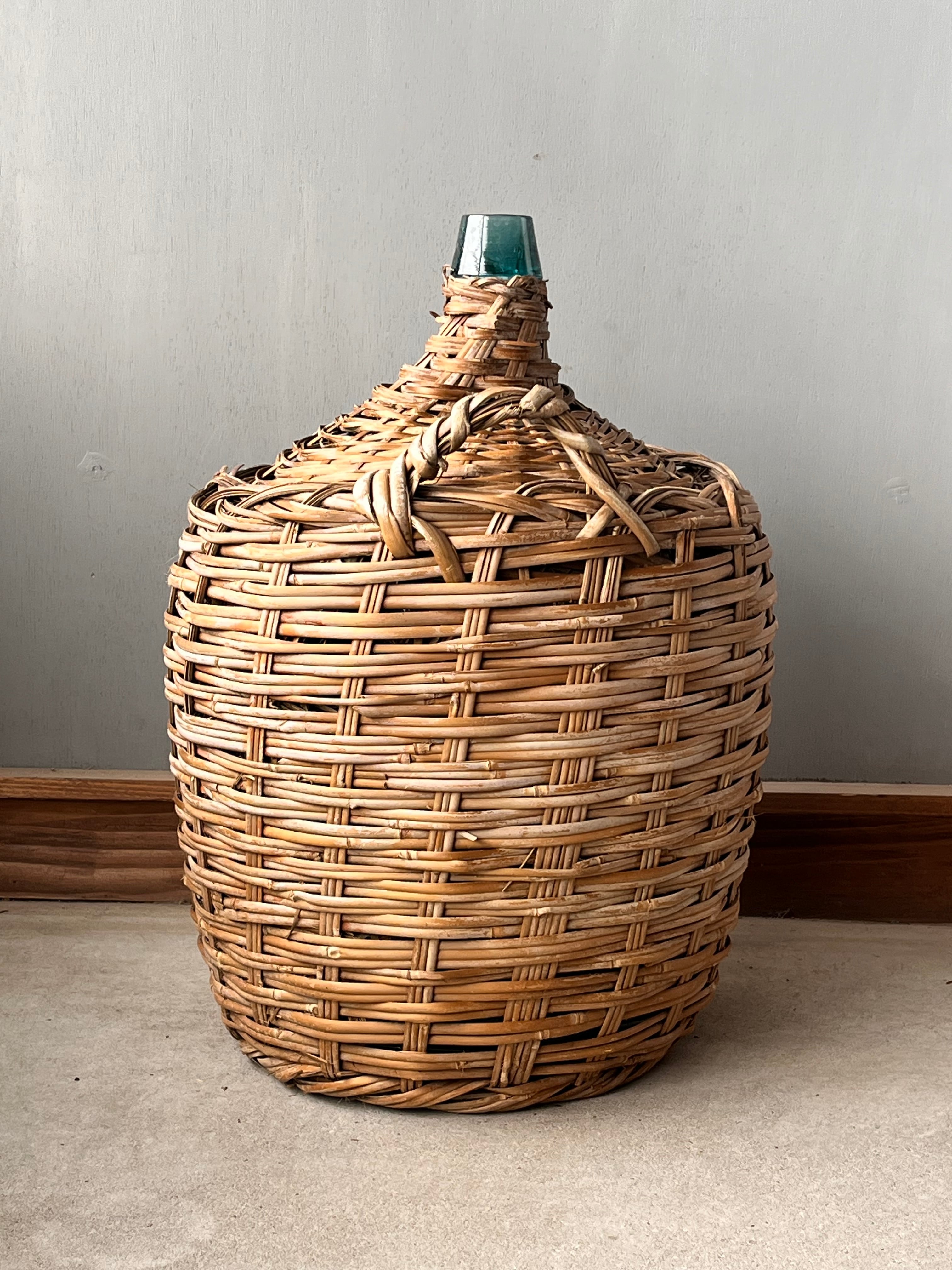 竹で覆われた青い瓶。枝物の花瓶に。