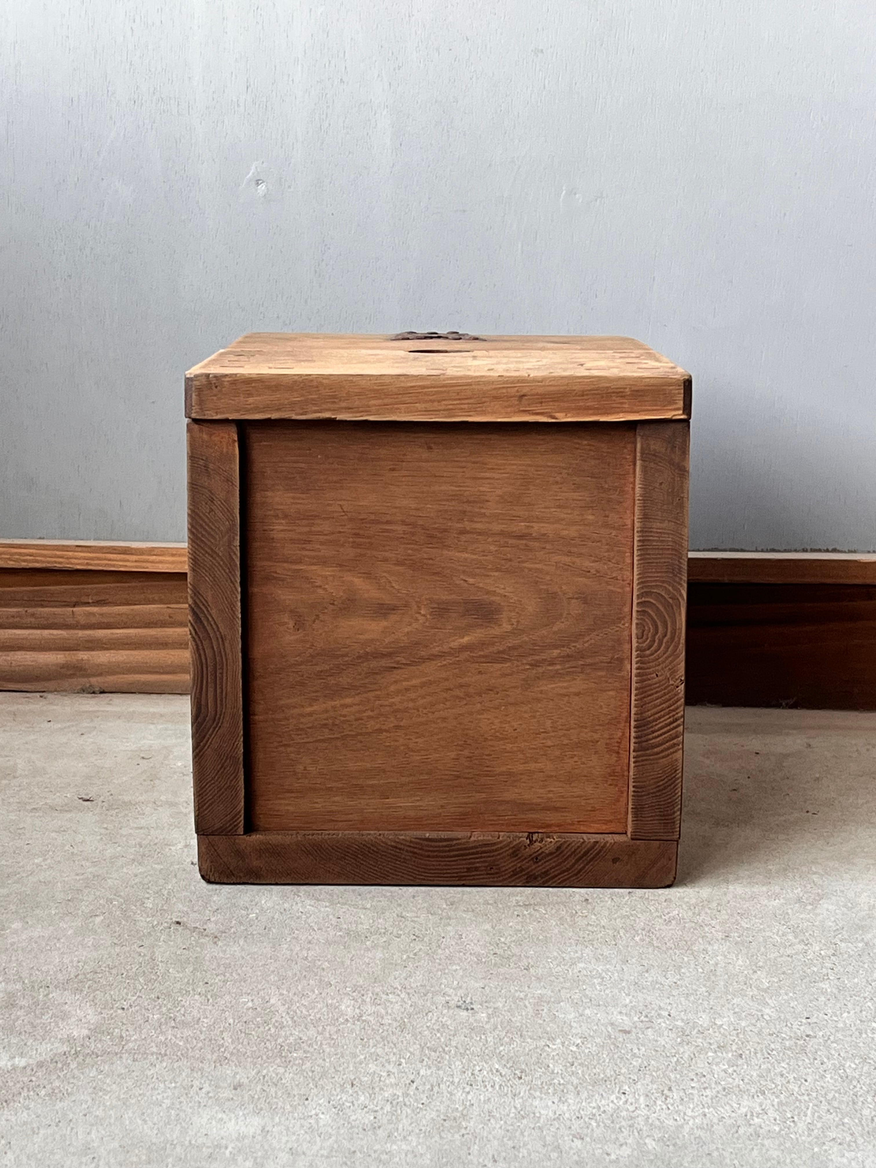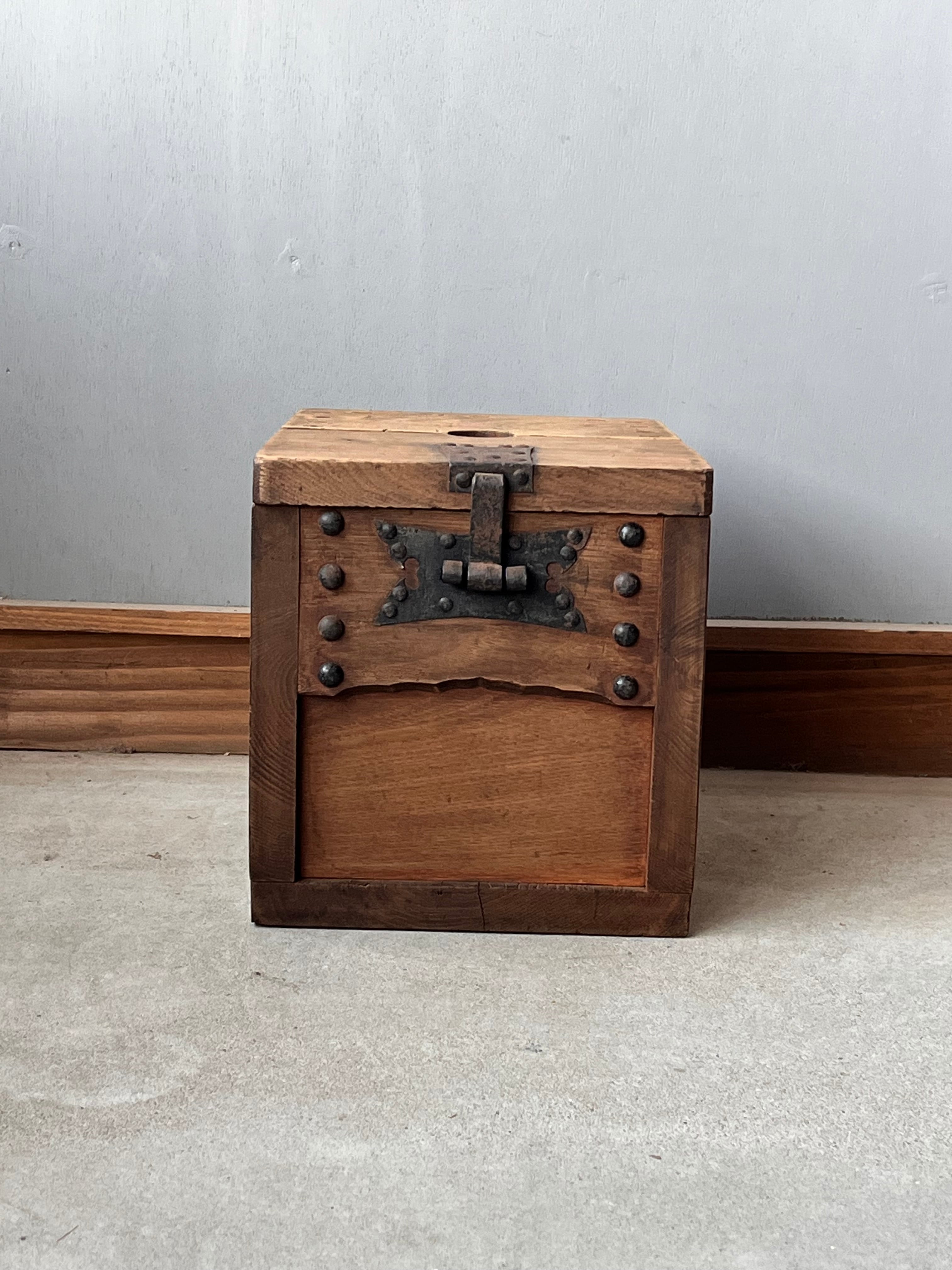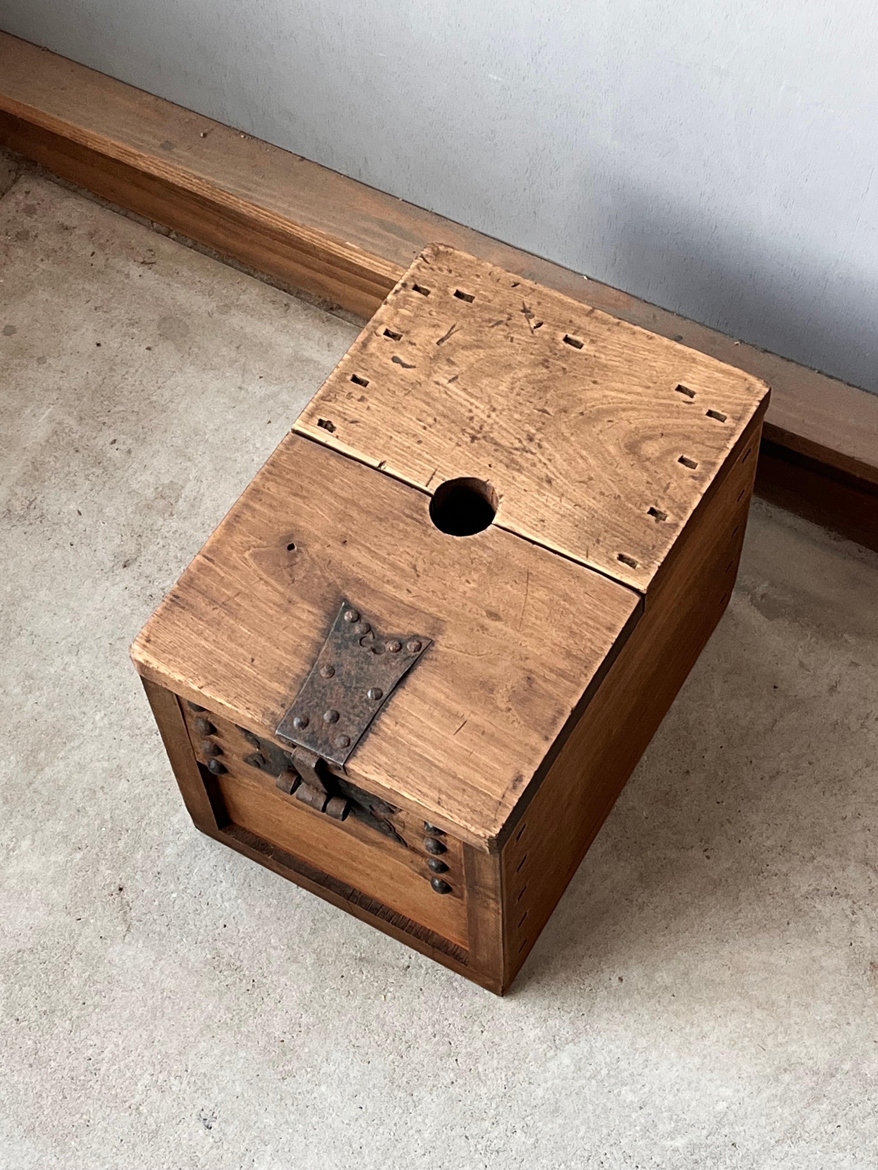 欅材使用。江戸〜明治頃、銭箱として使われていました。片側は外れますので収納に。