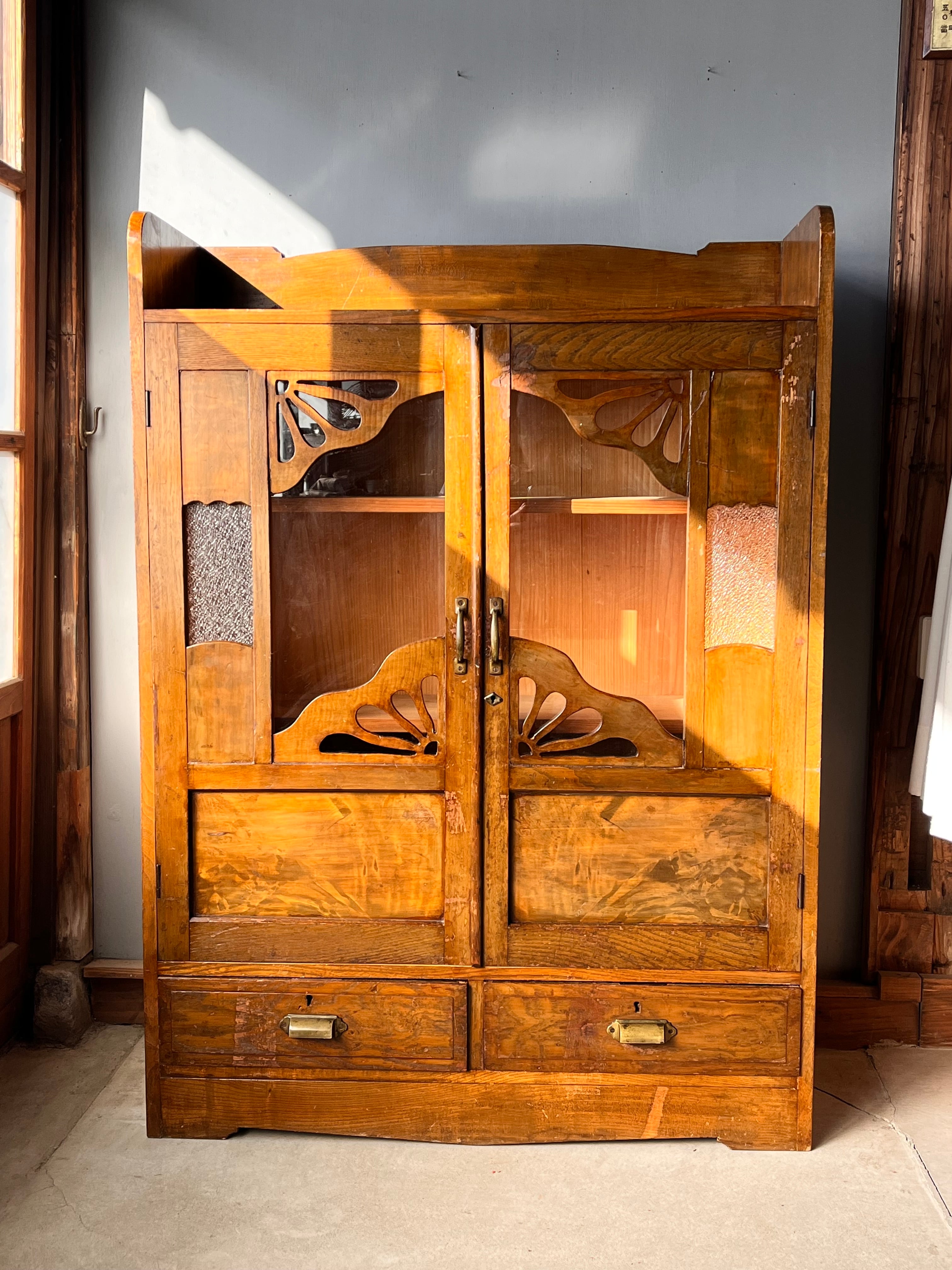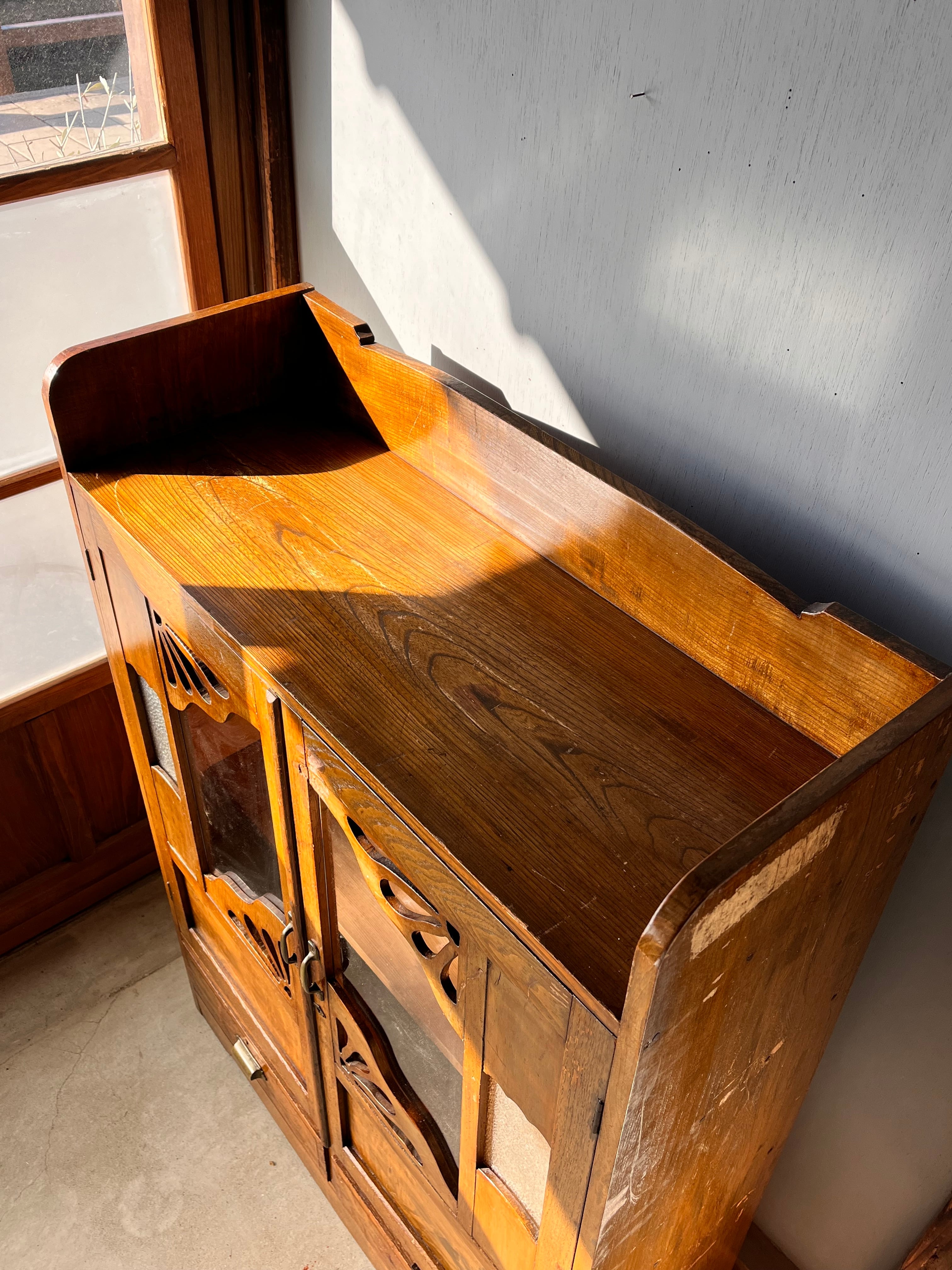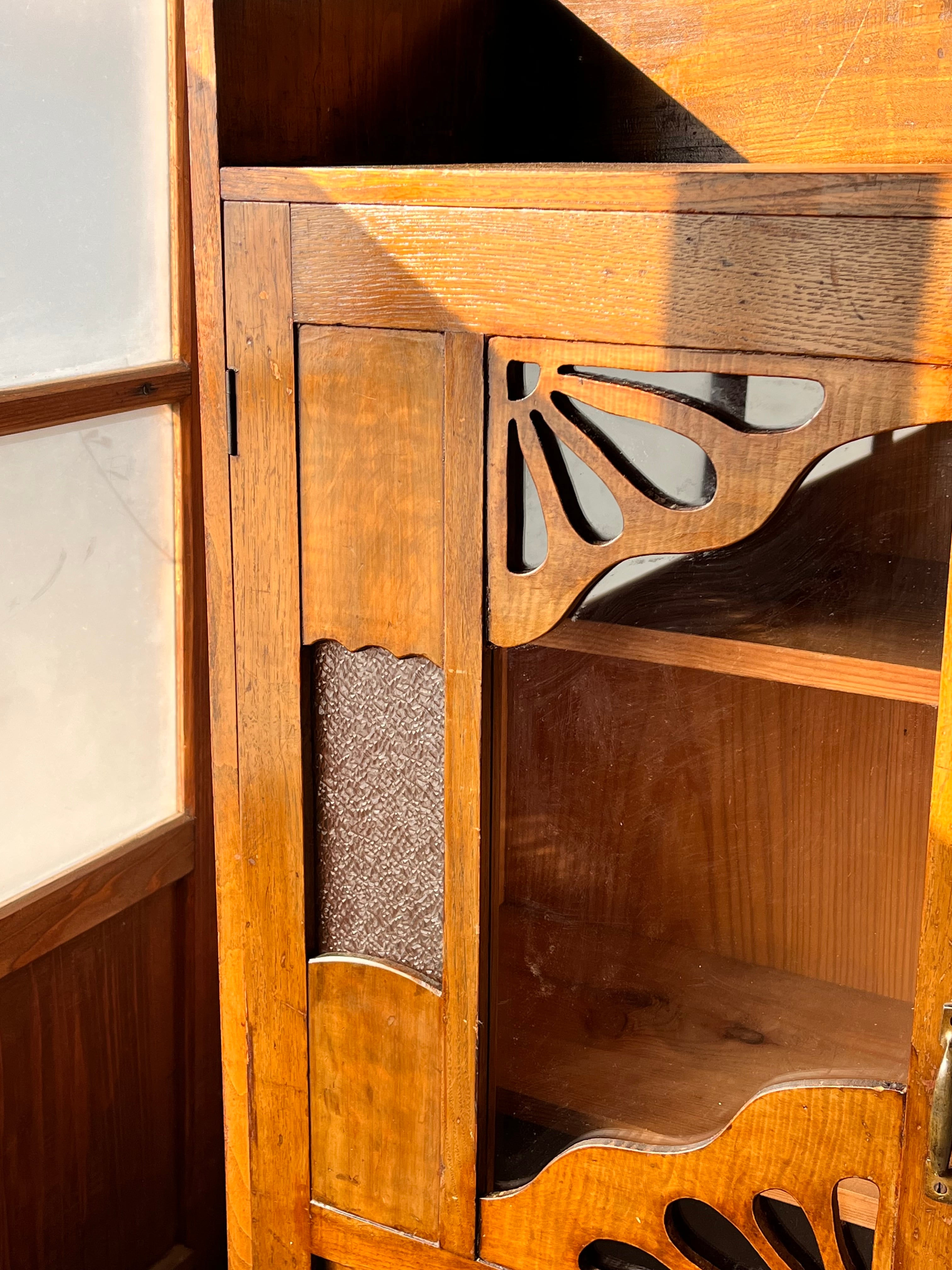 ダイヤガラスや蝶のような装飾を拵えた戸棚。