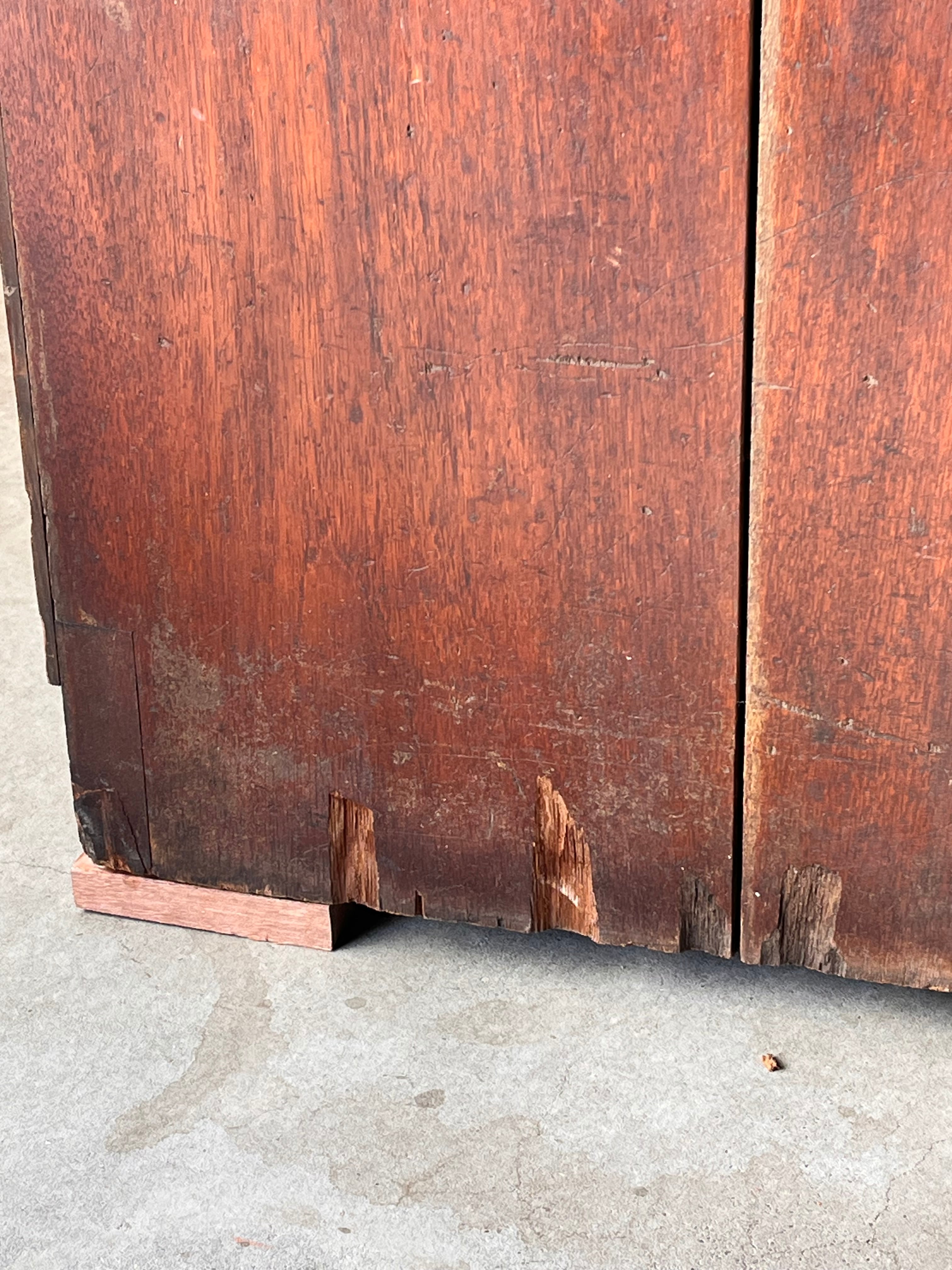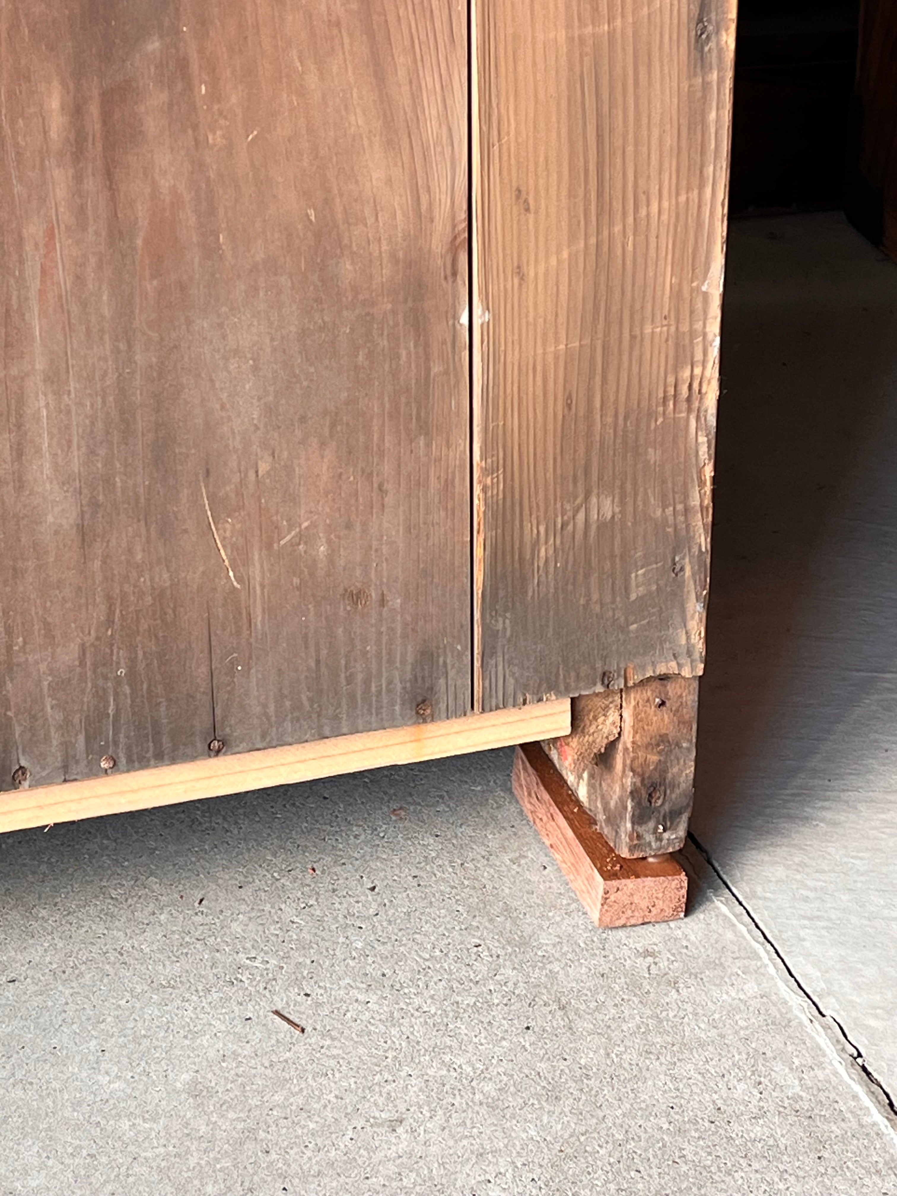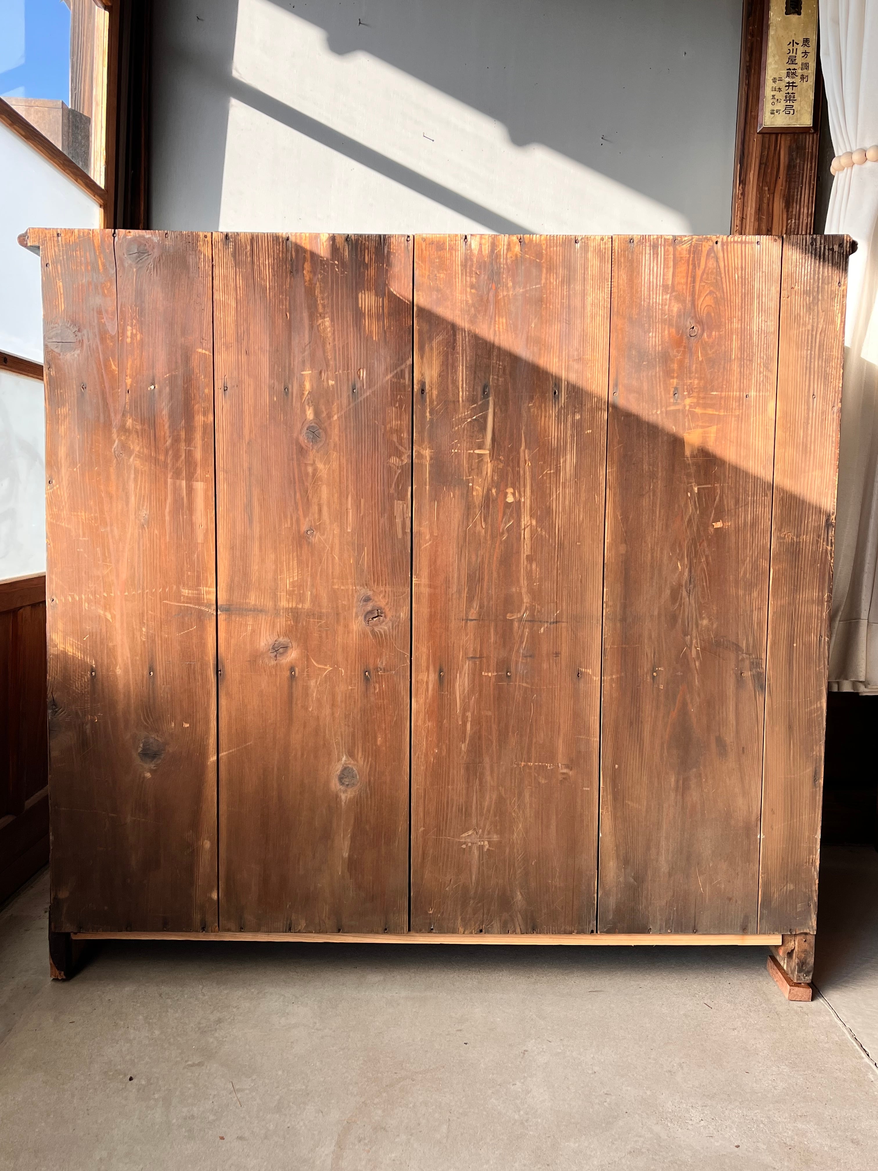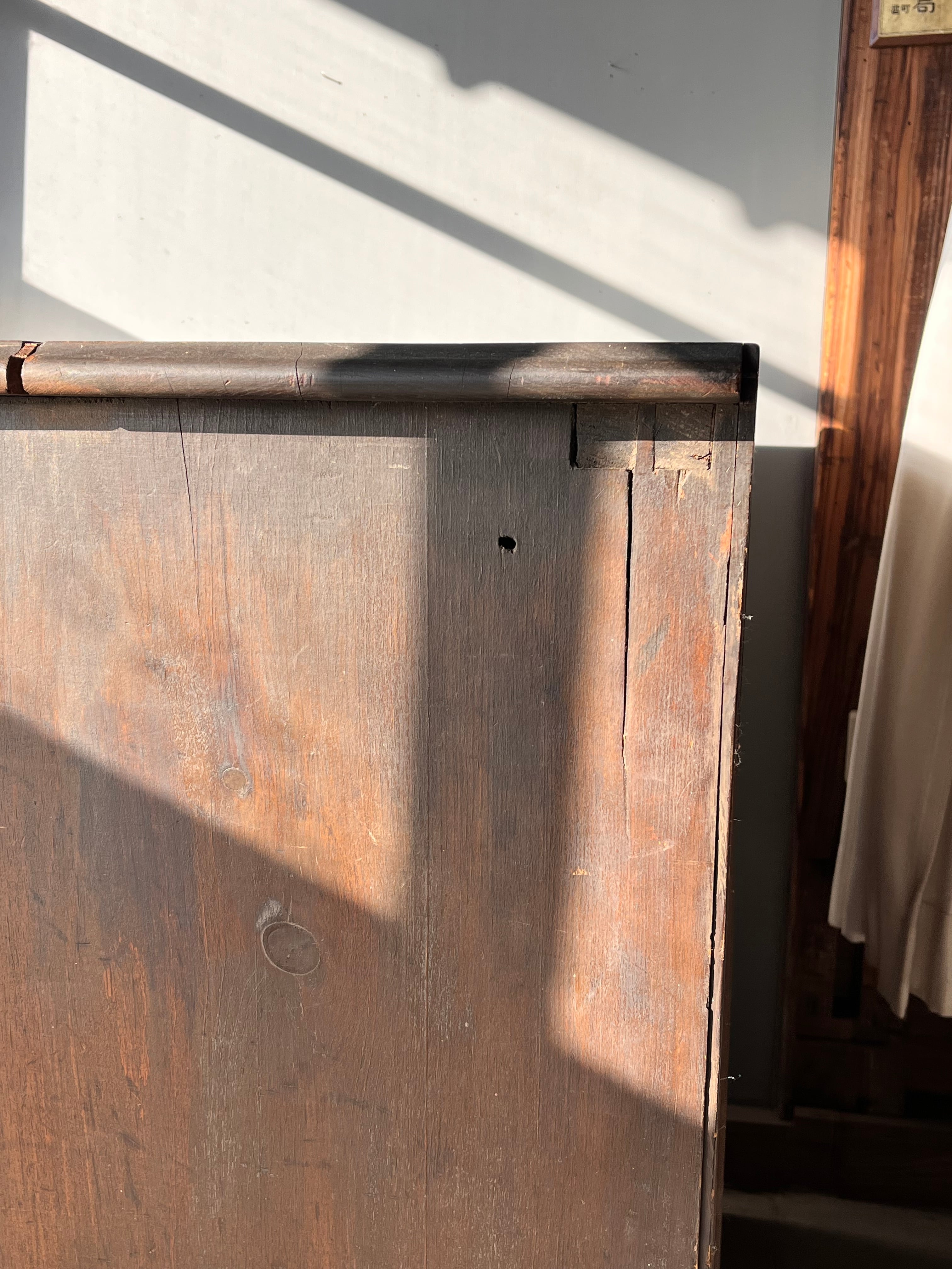 ショップカウンターにおすすめのイギリスのキャビネット。元々使われていたお店に合わせて作られたようで、床が水平出なかったのか曲がって作られていたため、水平を保つために簡単に下駄を履かせました。棚板は反りあり。取り外しも可能です。