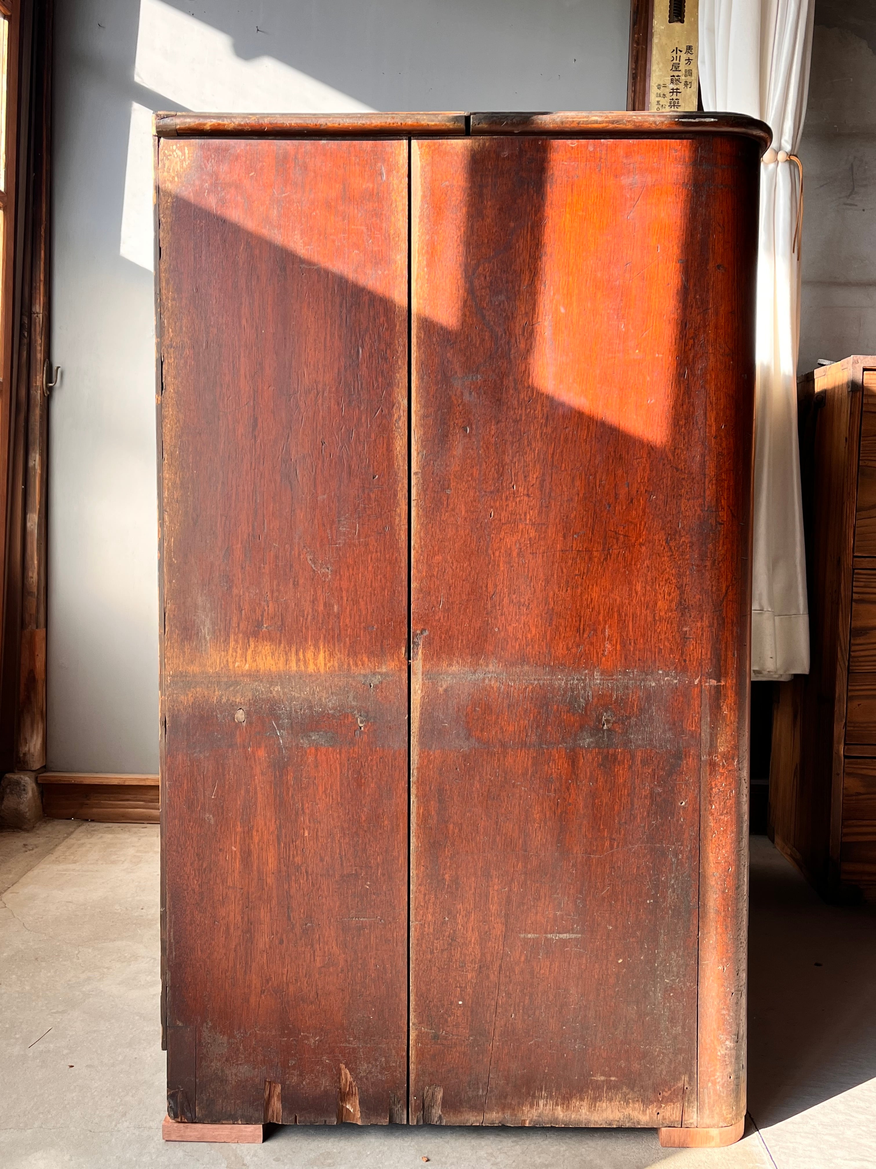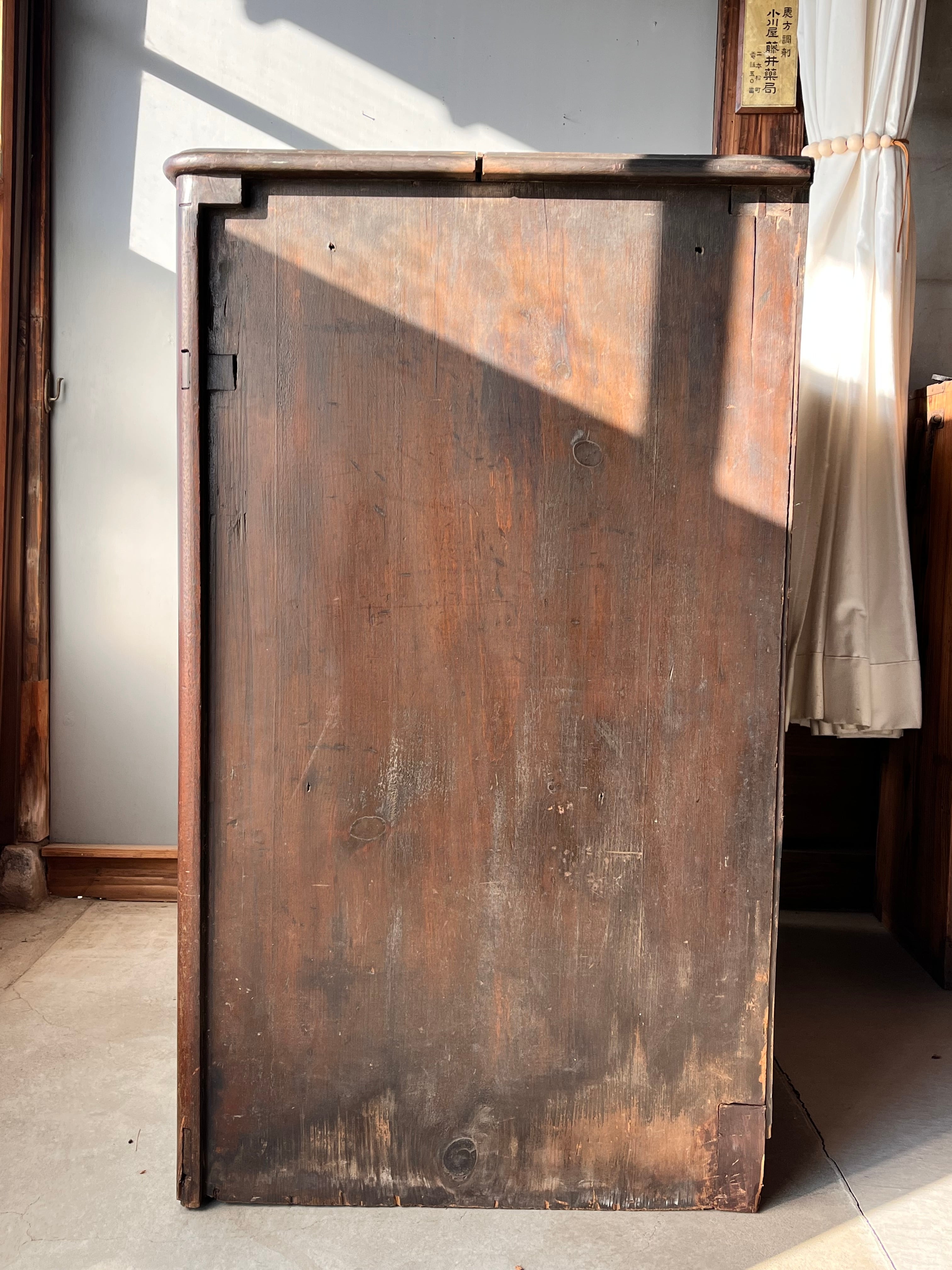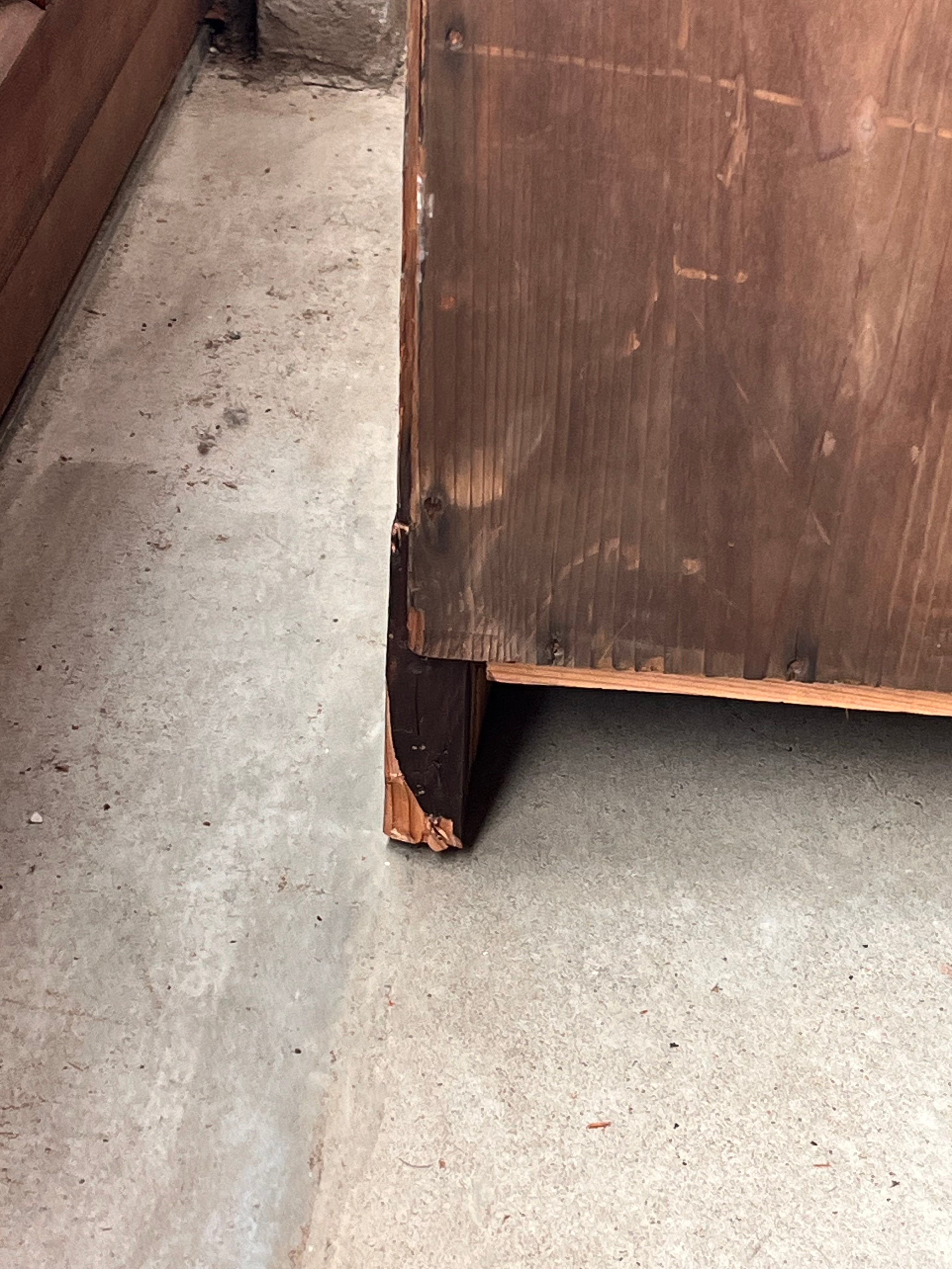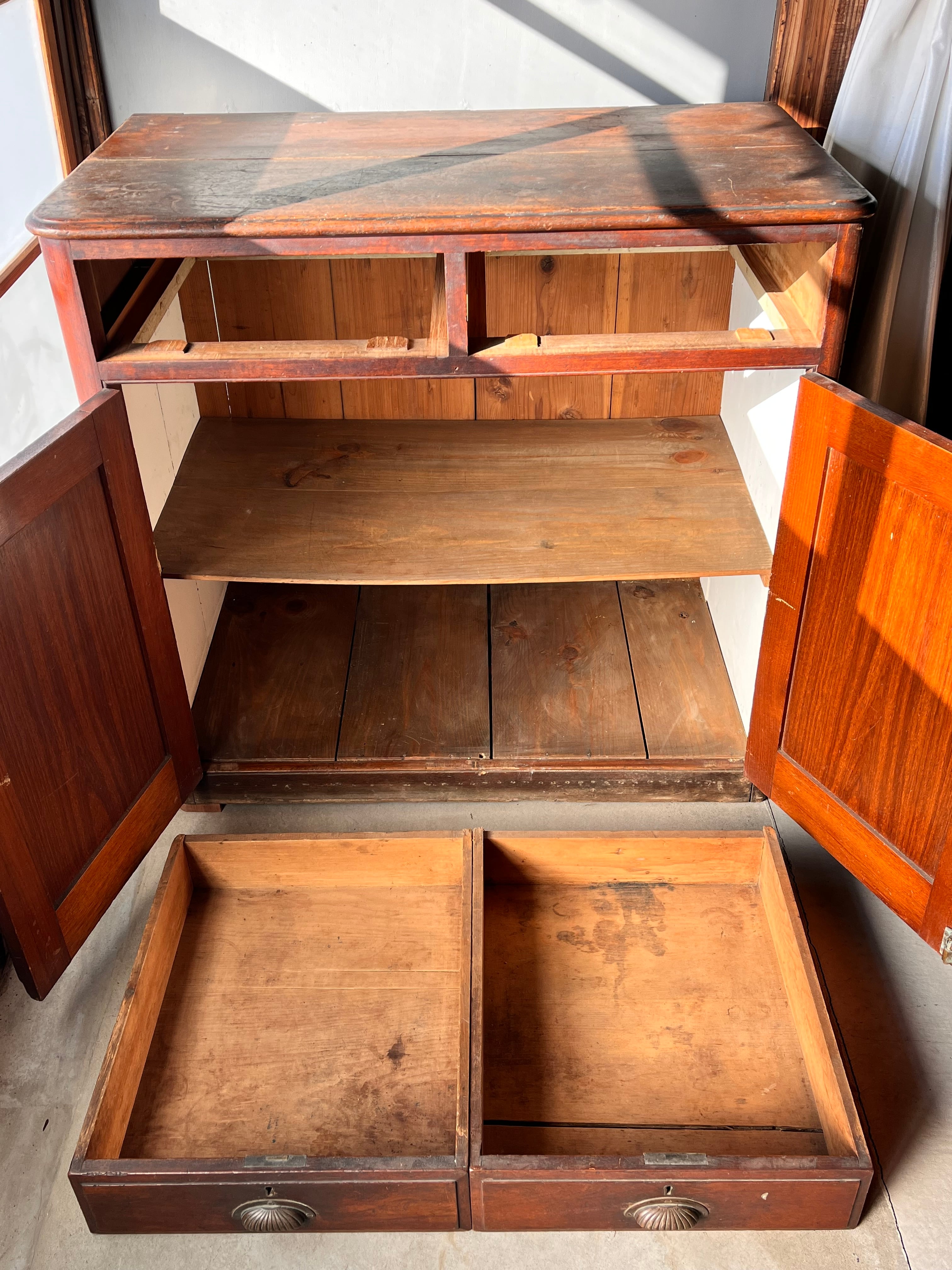 ショップカウンターにおすすめのイギリスのキャビネット。元々使われていたお店に合わせて作られたようで、床が水平出なかったのか曲がって作られていたため、水平を保つために簡単に下駄を履かせました。棚板は反りあり。取り外しも可能です。
