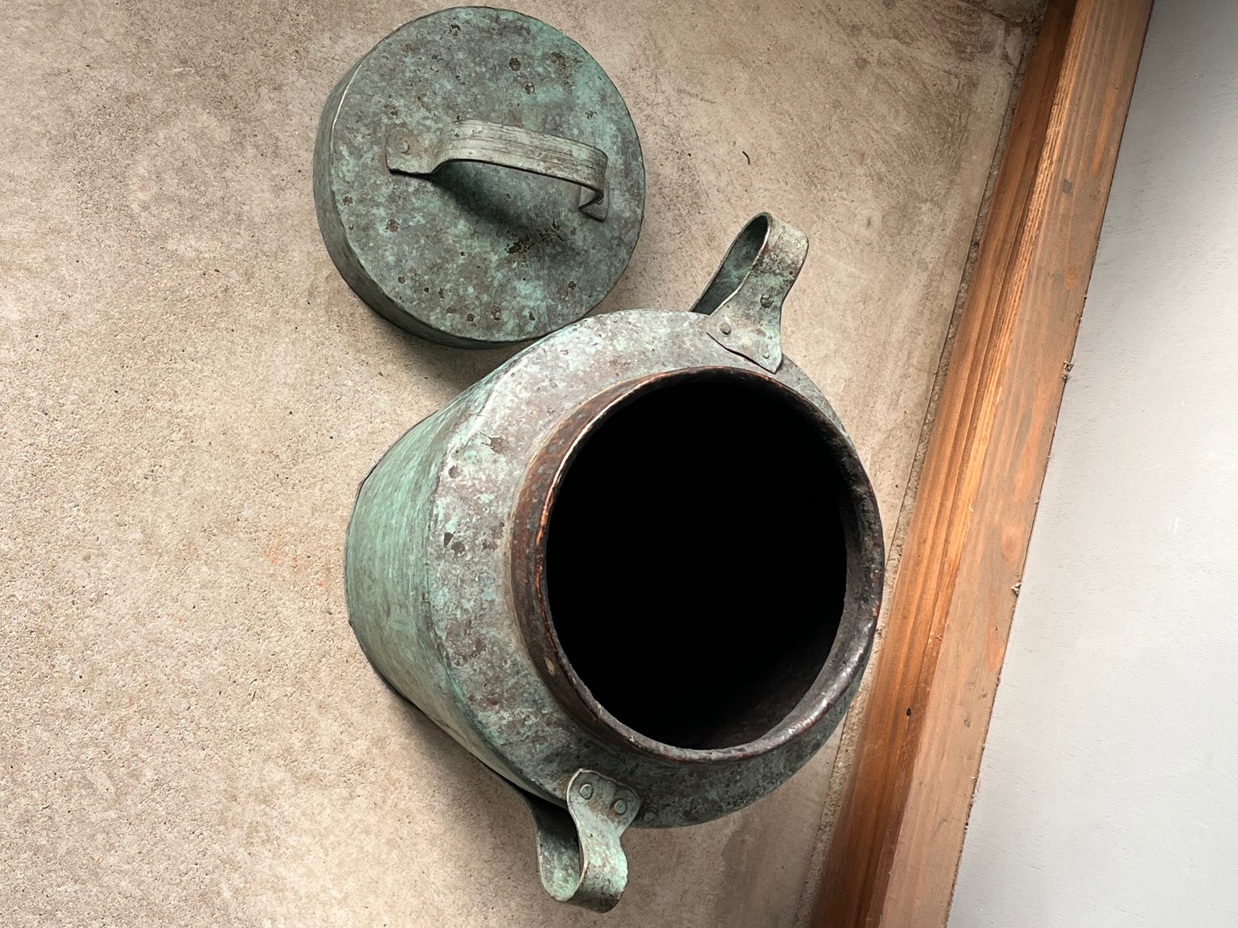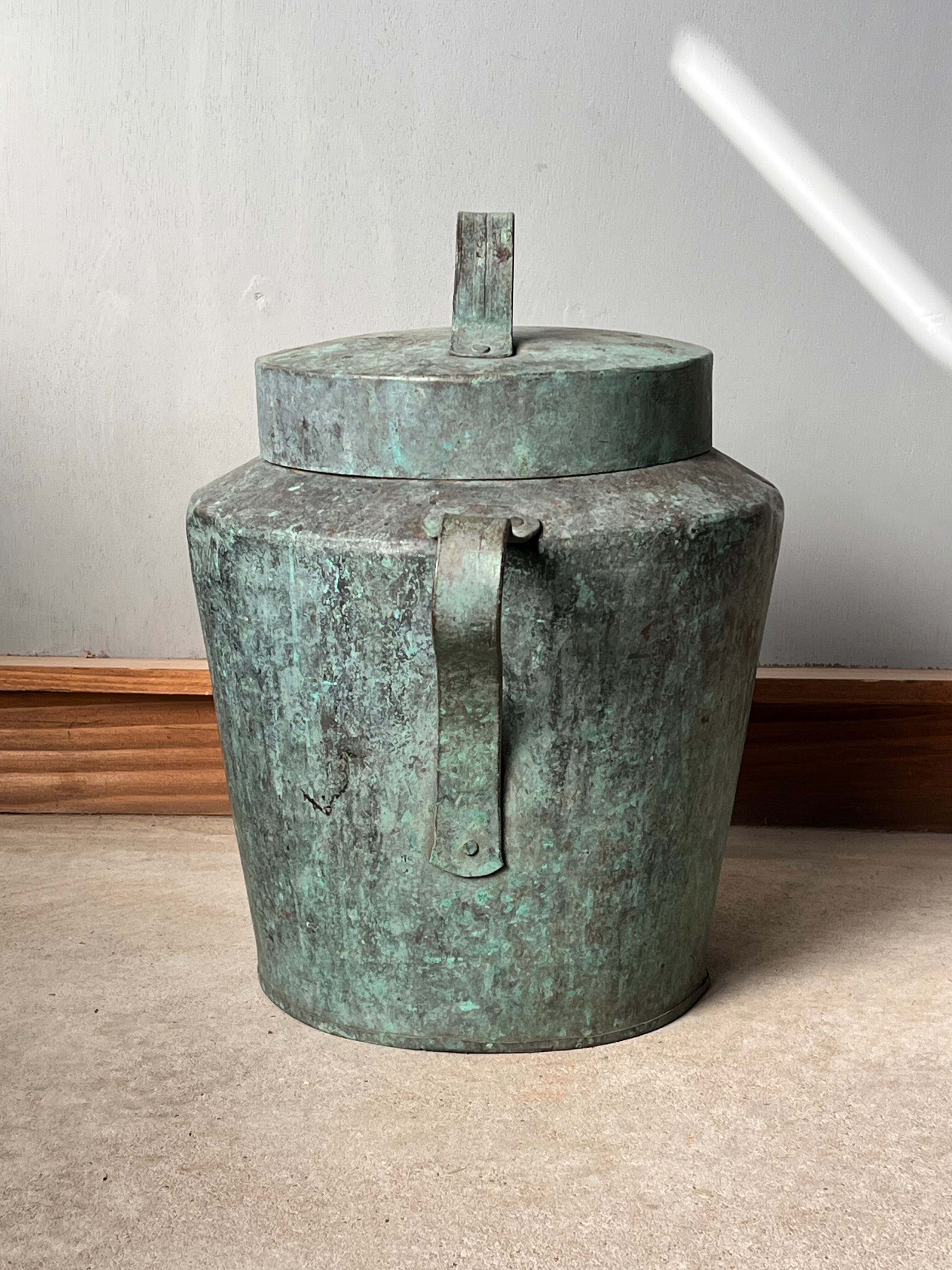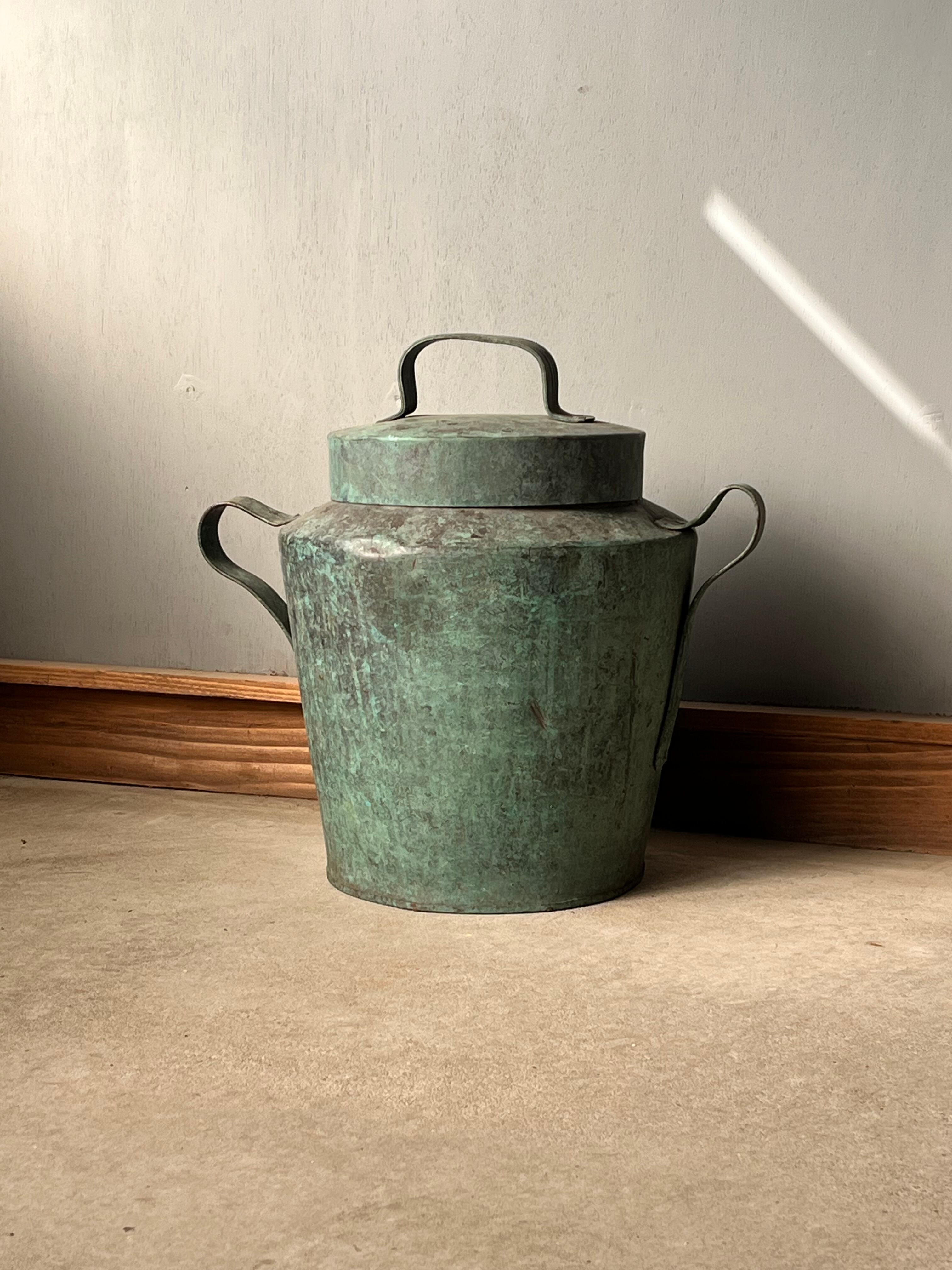 緑青が激しく、アートのように変色した炭壺。