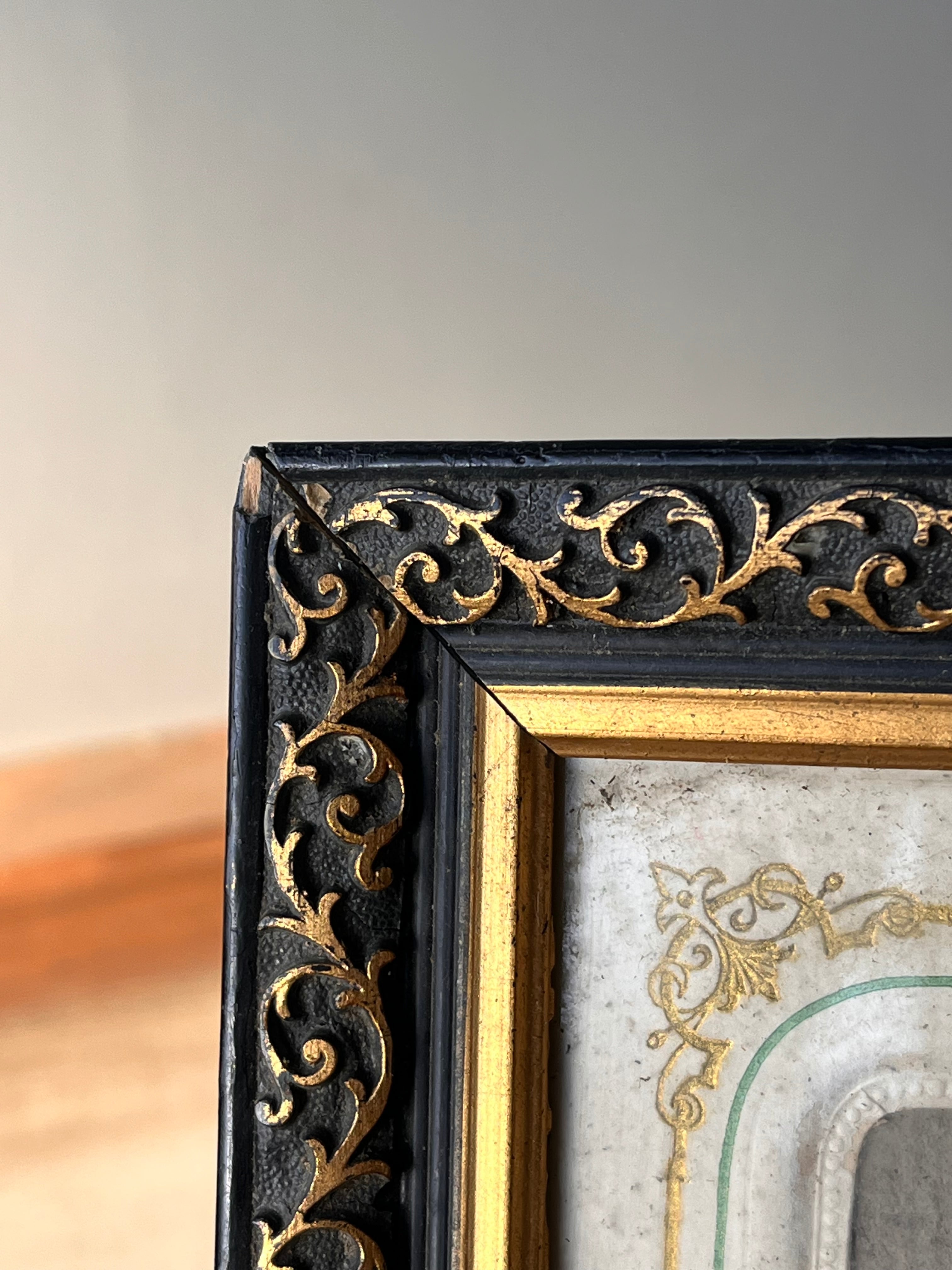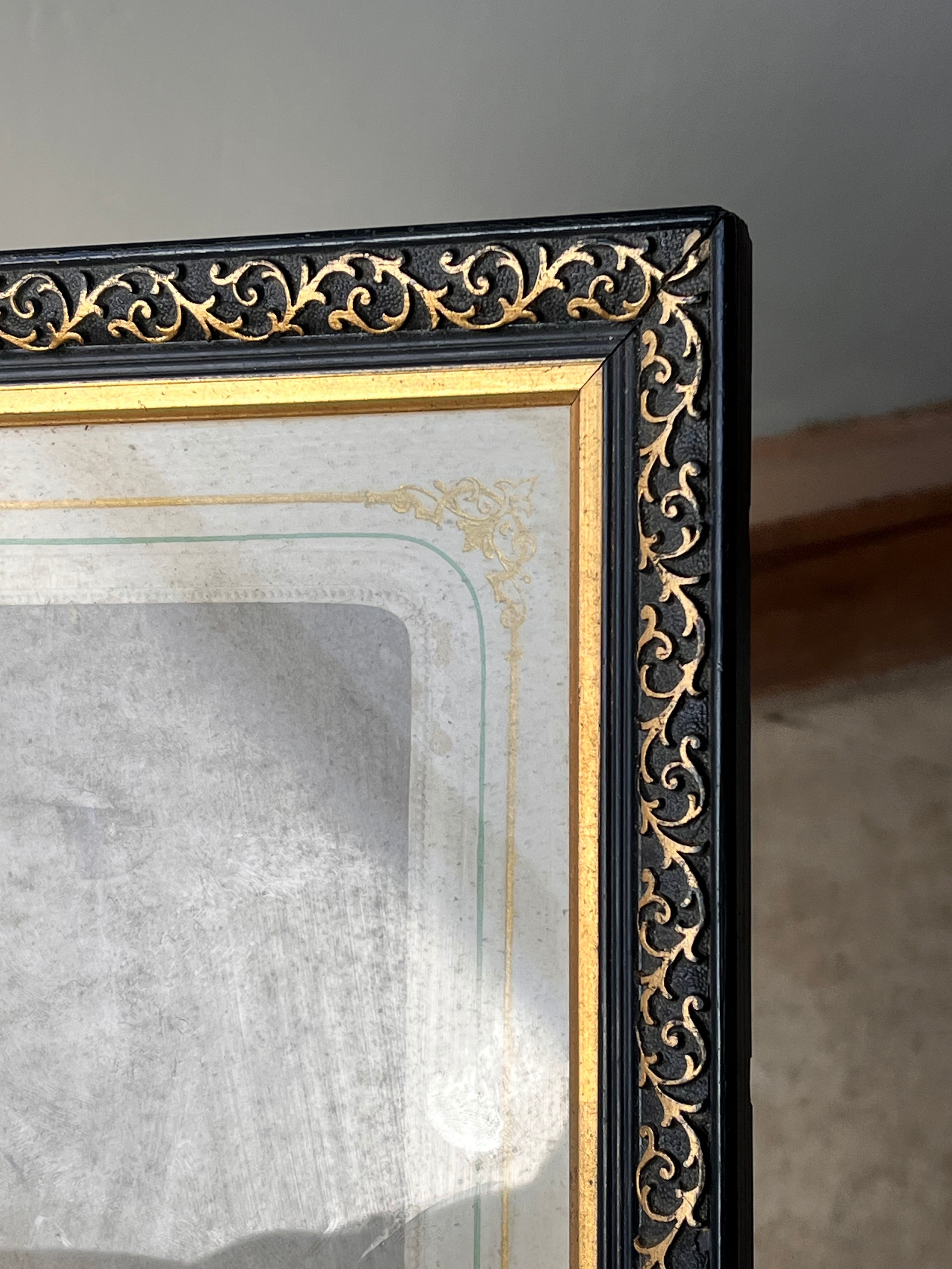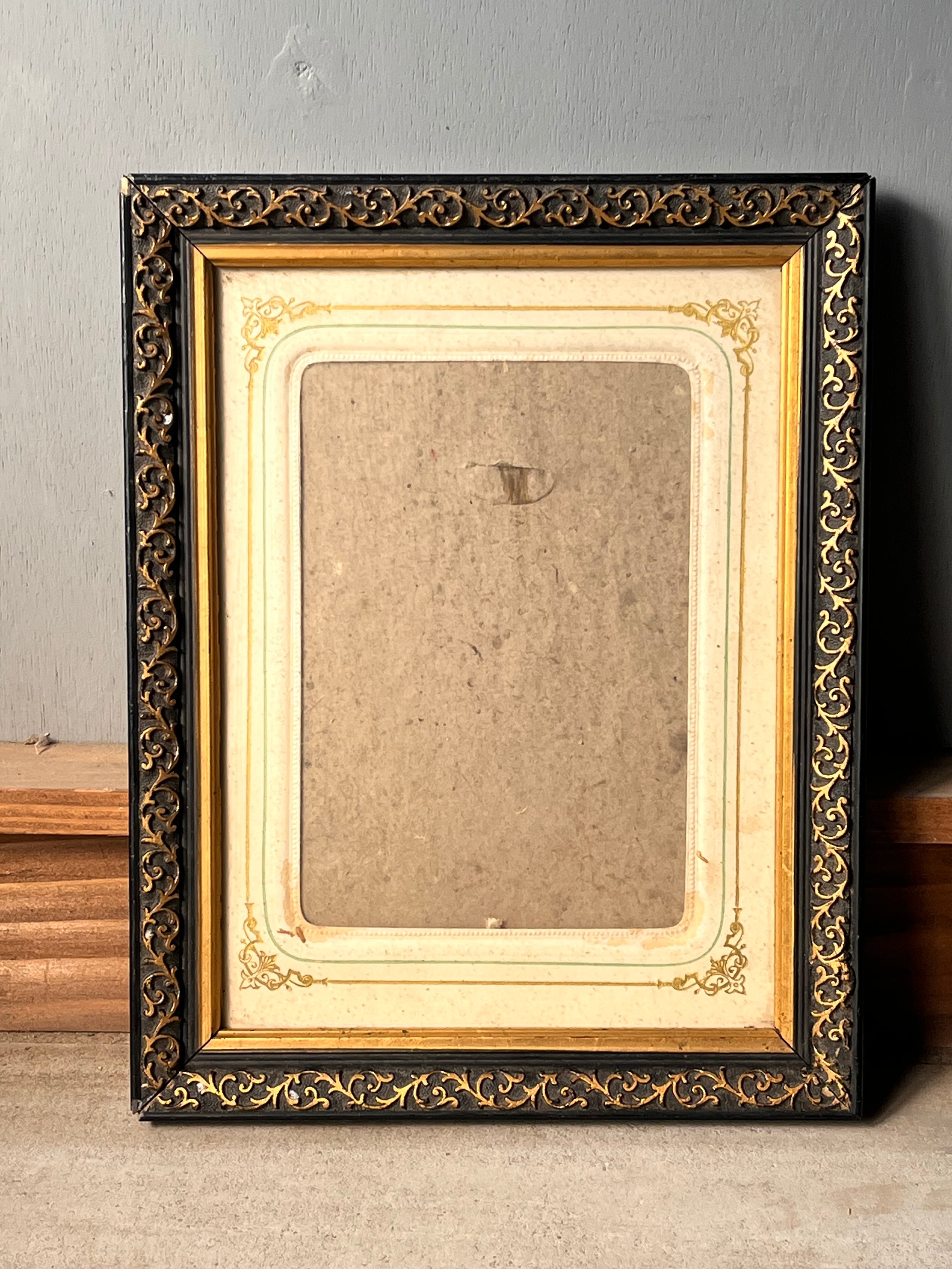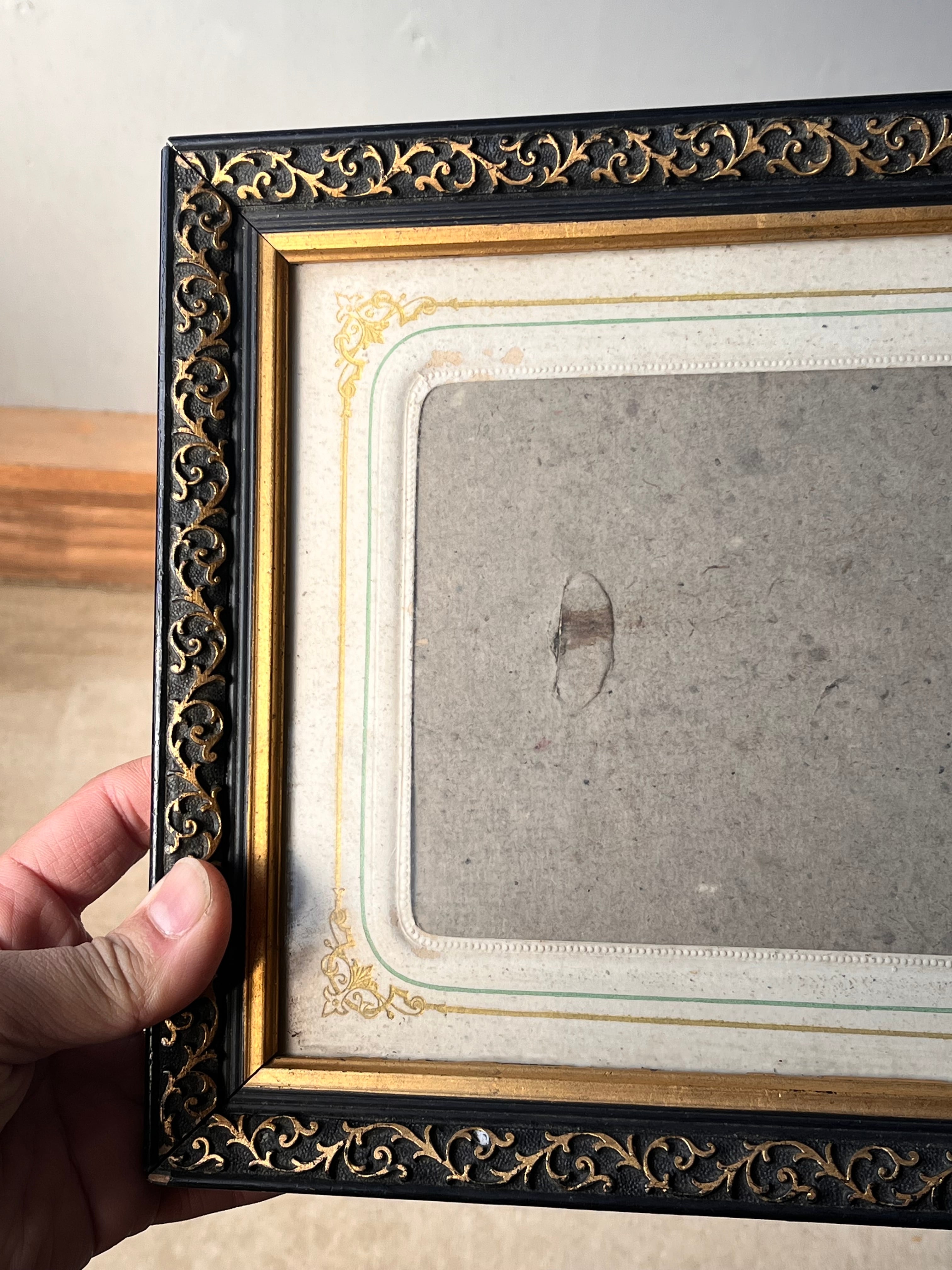 黒い塗装に金の装飾が特徴のナポレオン3世スタイルのフォトフレーム。裏側に隙間が空いているので、写真などを差し込んで入れるタイプになっています。家族写真を入れて飾ってみてはいかがでしょうか。